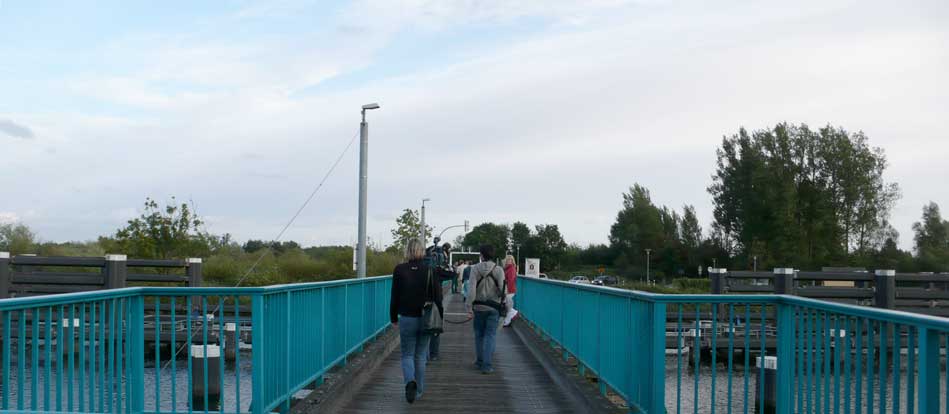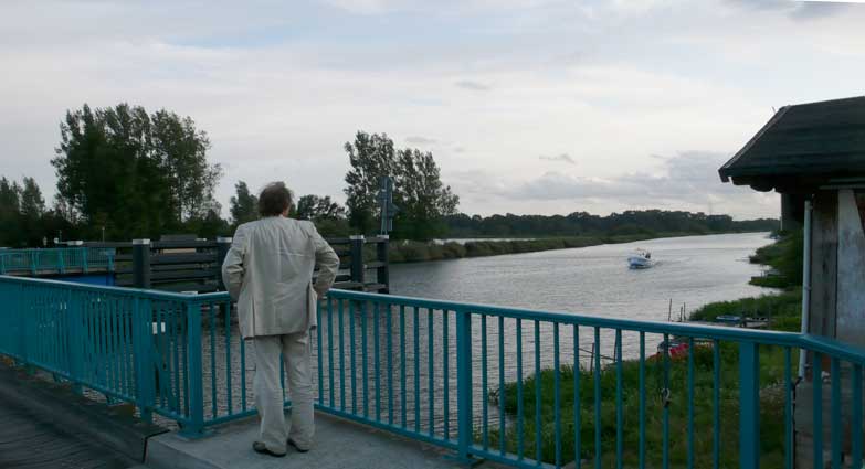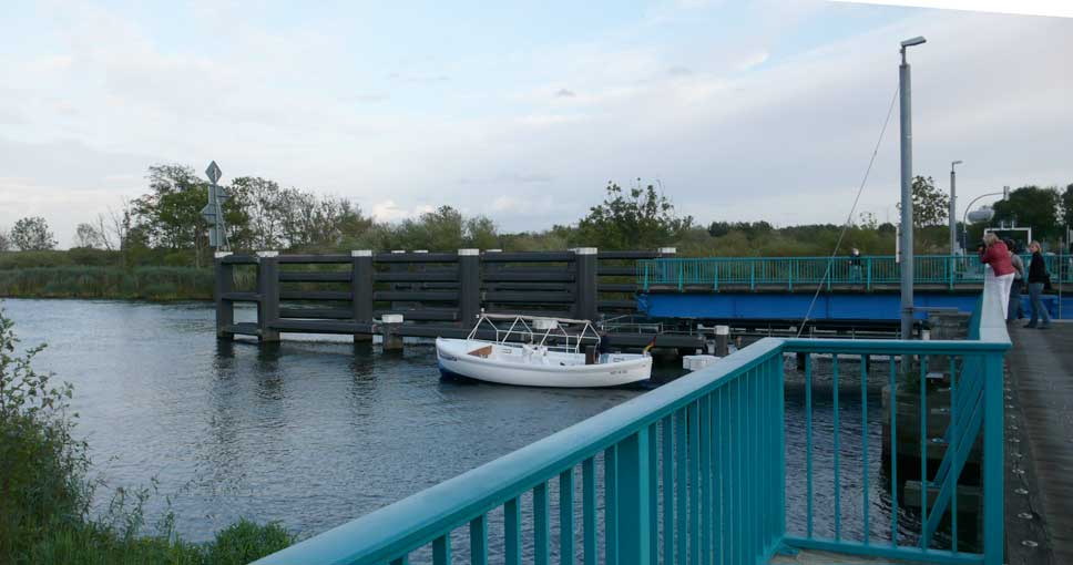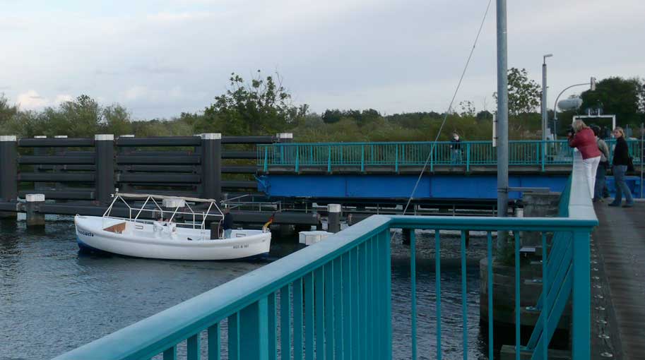 Die Brücke vor dem Abriss, weil zu schmal und von Hand zu bewegen nach Urzeit für Schiffe oder Autos. Mit Wärterhaus und schmalen Gassen.