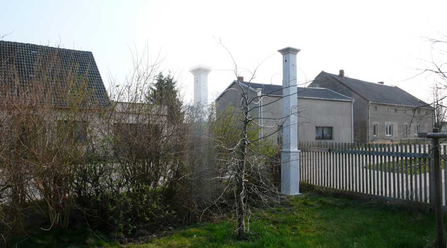 Und alle drumher erleuchtet, können zusehen aus den Häusern. Und so im Sommer zum Dorffest auf den Platz kommen, in das Zelt vielleicht. Offen nach allen Seiten der Platz