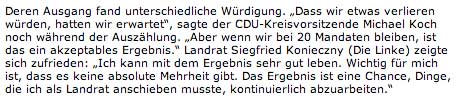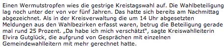 Die "Wahl" in N. ohne Plakat. OhneWahl zwischen Kandidaten. Ohne Bekanntgabe eines Wahllokals,( es sei denn allen bekannt von früher. Plattenbau, DDR), keine Vorstellung von zu wählenden Programmen, ohne Veranstaltung zu Diskussion, Fragen wer stellt den einen(zur Bestätigung) auf Bedenken, gegen die Würdigkeit des einen zu bestätigenden Namens(Blockwartsystem), trotz aufendes Dienstaufsichtsverfahren), wie kommt der zu "wählende" (abzunicken) dahin ohne Antwort. Farce. Volksverdummung. Anfechung?