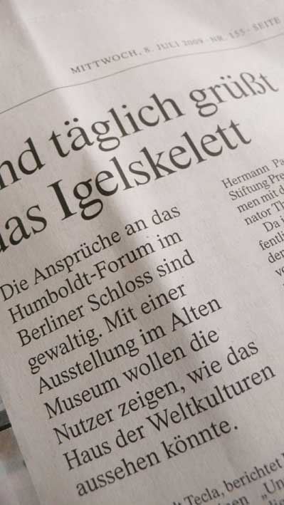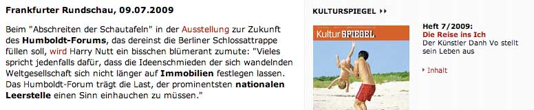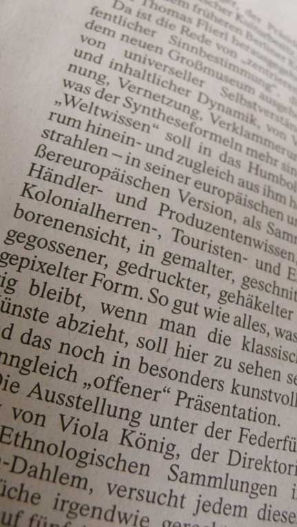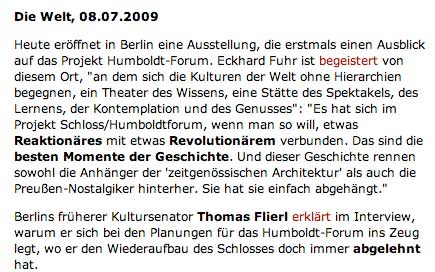 Nun gehts wieder los. Und ausgerechnet F. aus der Ecke der Hochverräter. Das sogen.Humbold-Form als Allibi für die Schlossentscheidung. Als ob wir nichts anderes zu tun hätten als uns um die Welt kümmern und Langweile zu verbreiten, die Welt, wenn sie schon kommt zu weiteren Allibi-Statements zu nötigen. Die H-Agora als Symbol für deutsche Feigheit überall. Wenn sie nur den einen Satz über die Bäume von ihm nähmen, wärs schon gut. Und dann sei ihm in Ruhe gewidmet das ganze Haus Preussens. ohne Land.