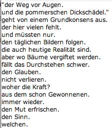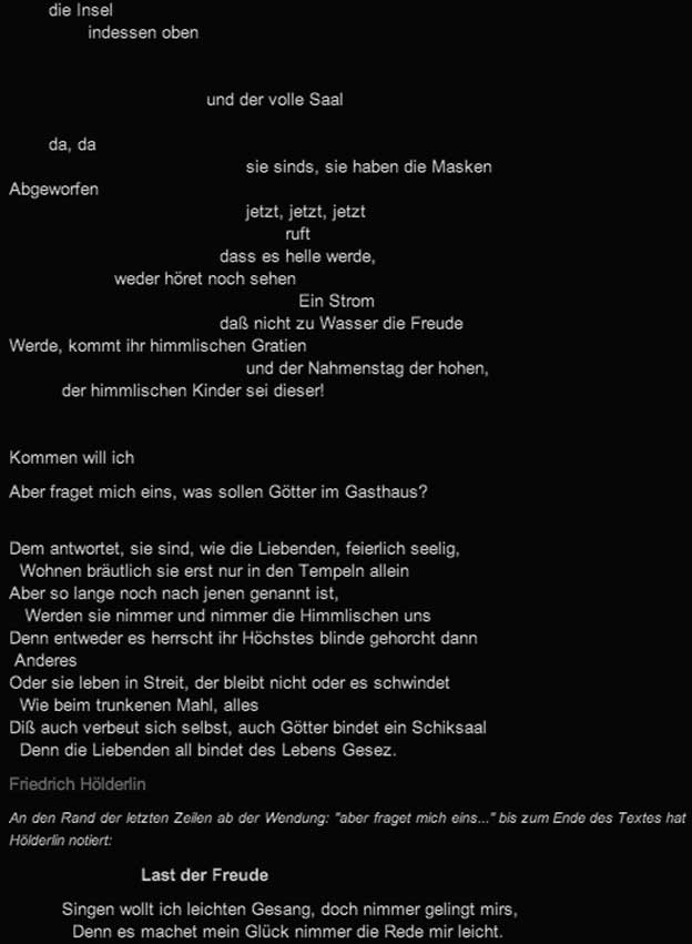 Da nun war unser Autritt mit der Käthe Reichel geplant. Übergeben an Edith Clever/Hölderlin den Fragmentarischen letzter Gesänge des Komm ins Offne Freund... mit dem Gang aufs Land. Wie nur sie es kann mit den Pausen in Varianten und Brüchen voll des Verschwiegenen, stehend im märkischem Sand vor steiler Wand unserer Geschichte. Geprüft und bestanden. Wie der hohe Ton nur erlaubt ist in Brüchen und der Varianten und Wiederholungen, seitdem wir die manuskripte kennen. Hier... nun. Ein neuer Versuch. Am 1. Juli.