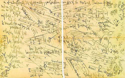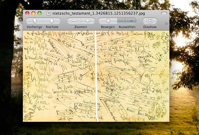 Das singuläre Zentrum des Bandes ist aber der Erstdruck eines «Zettels» aus der immer noch vernachlässigten Wahnsinnszeit Nietzsches. Das Jenaer Krankenjournal vermerkt dazu am 5. Mai 1889: «Gibt dem Arzt einen schmutzigen, unleserlichen Zettel als sein Testament». Dieses beidseitig beschriebene «Testament» ist indessen keineswegs völlig unleserlich. Neben den berüchtigten Kritzeleien des irren Nietzsche zeigt es notenschriftliche Fragmente und den zweifach unterstrichenen Namen Richard Wagners, aber auch die Anrufung eines «Diaboli! Furz! Stimulus», die jedem deutschen Doktor Faustus Ehre gemacht hätte. Ein abgründiges, ein tief bewegendes Dokument.