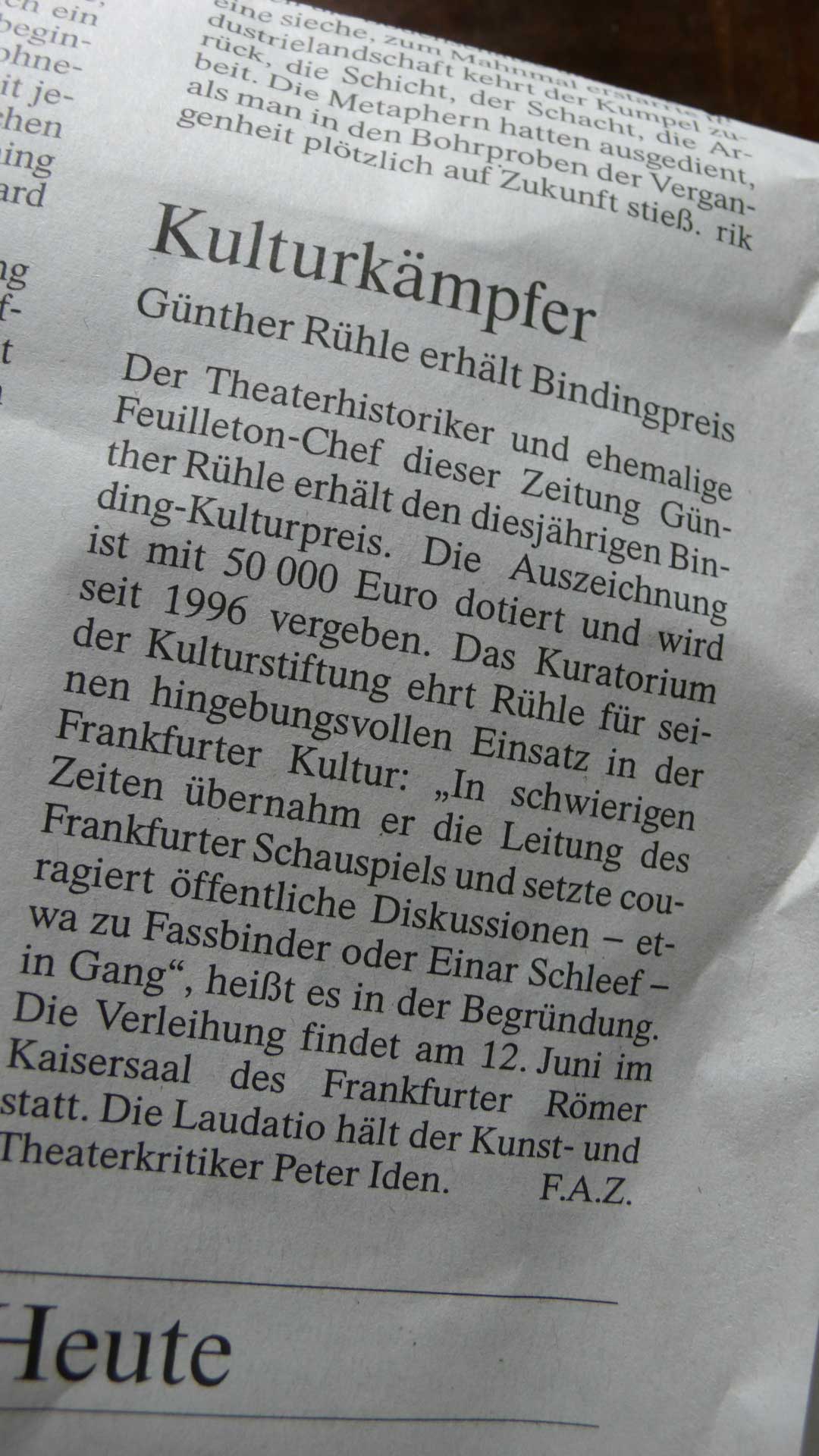Ein 50 tsd Euro-Preis für G.R. gut. Binding -dachte zunächst an Georg Binding(Opfergang). Rühle und Binding? Dann schaue ich nach, Waldstiftung? nein, schade, Bier: Brauerei in Franfurt, Radeberger, auch gut.
