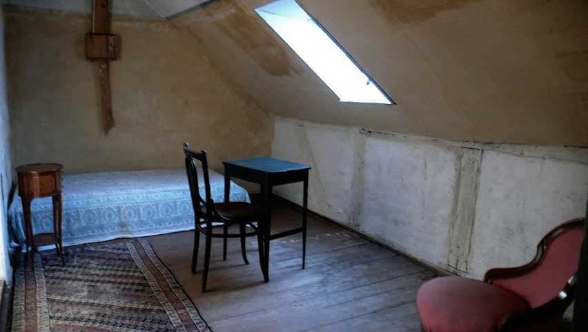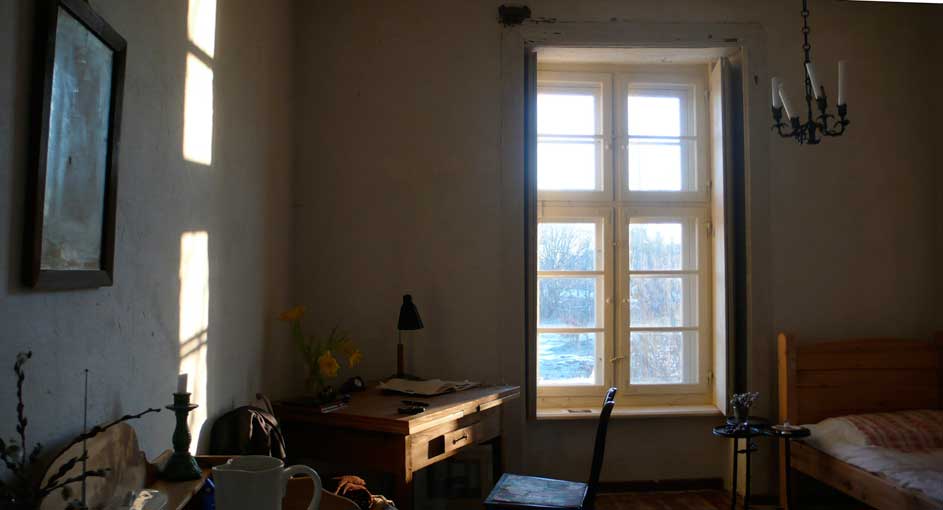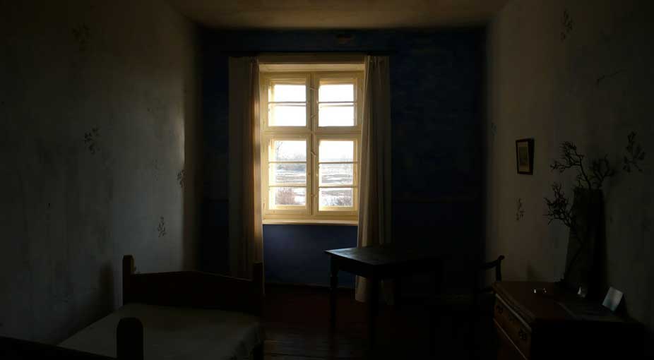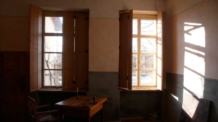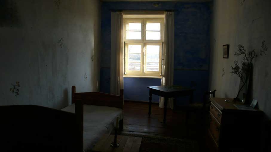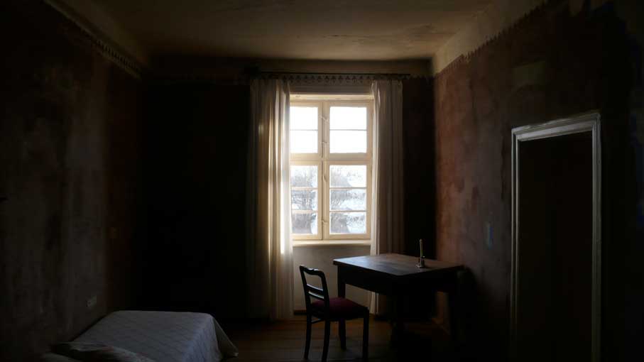 oben nun dazu noch moprgendlich frisch und mit harten Schatten der Farben die Zimmer der Gäste früher. Oder des Kindes und Kindermädchen/Inga offiziell, und der Mamsell