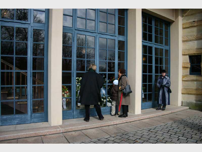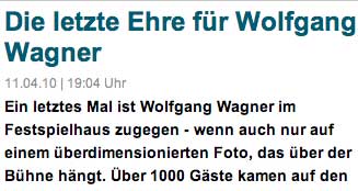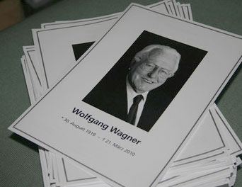 BAYREUTH. 30. August 1919 bis 21. März 2010. Zwischen diesen beiden Tagen erstreckte sich das lange, ereignisreiche und erfolgreiche Leben des gebürtigen Bayreuthers Dr. Wolfgang Wagners. Der langjährige Leiter der Bayreuther Festspiele verstarb heute vor drei Wochen im Alter von 90 Jahren. Gut zwei Wochen nach der Trauerfeier im engsten Familienkreis fand an diesem Sonntag nun die öffentliche Trauerfeier an seiner Wirkungsstätte, dem Festspielhaus, statt.