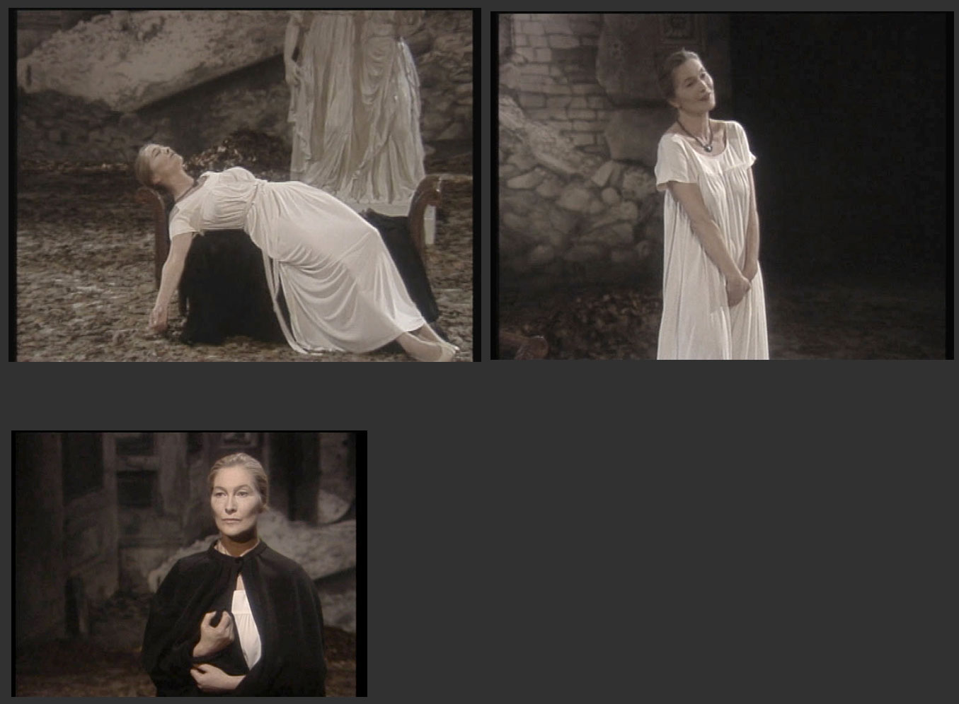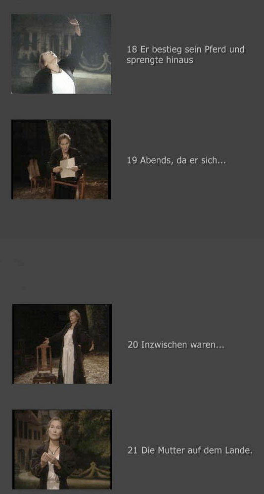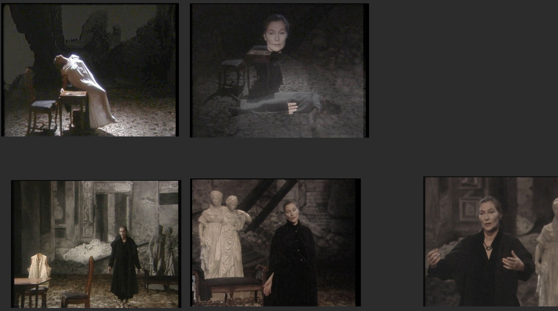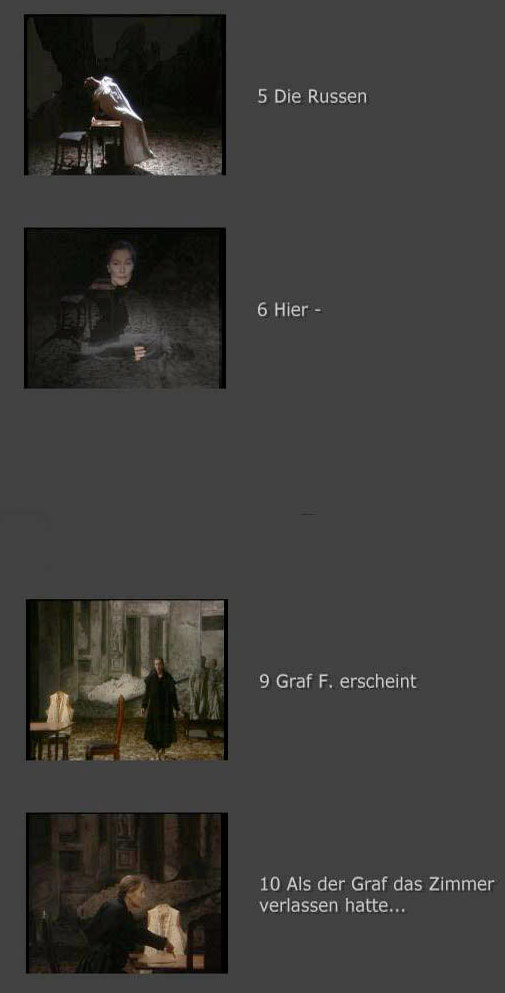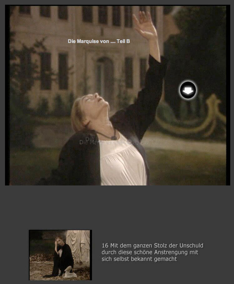 Später, als die Monolge Die Nacht schon und die Penthesilea enstanden waren, versuchten wir diese Marquise noch einmal zu machen, nun den ganzen Text Wort um Wort und aus einer Person alles. Die ganze Welt. Ein Glück, dass das andere Modell und nun dagegen bunte System von einem Meister war. Die Revolution aber für den Film und das Theater, was damit geschah, ist noch gar nicht erkannt. Was die Kunst der Darstellung heute angemessen in der Vorstellungskraft der Zuschauer aktivierend vermag. Und diese Marquise wieder anders als was davor war und noch kam. Die Veränderungen des historischen Bilderbogens, auch am Text Kleistes durch R. selbst waren jetzt nicht nötig, um filmisch zu sein. Alles geht in uns vor sich. An der sinnlichen Erscheinung vor uns.