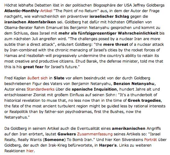 Wann wird man erkennen, was die Welt von Krieg zu Krieg und ihre Niederlagen treibt. Israel ist nicht der Flugzeugträger der USA in der arabischer Region des Öls, sondern das Unheil der USA selbst. Trublemaker No.1 der Welt und nicht aus Not seiner Herkunft, sondern aus rassistischem Hochmut.Die Hybris bringt sie zu fall. Frage ist nur wieviele reissen sie mit nach Palestina, und seine Nachbarn, Irak, Afghanistan und nun bald Iran. Als Modell wie ihr Frieden aussieht.