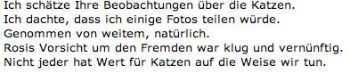 täglich statte ich Ihrem Nossendorfer Tagebuch einen Besuch ab. Heute Rosis Abschied. Es hat mich sehr getroffen, ich war immer ein heimlicher Fan von ihr. Habe mich immer gefreut, wenn wieder ein neues Bild von ihr im Tagebuch auftauchte. Ein wunderschönes Tier. Auch ich werde sie vermissen. Ich kann Ihren Schmerz über diesen Verlust nachempfinden.