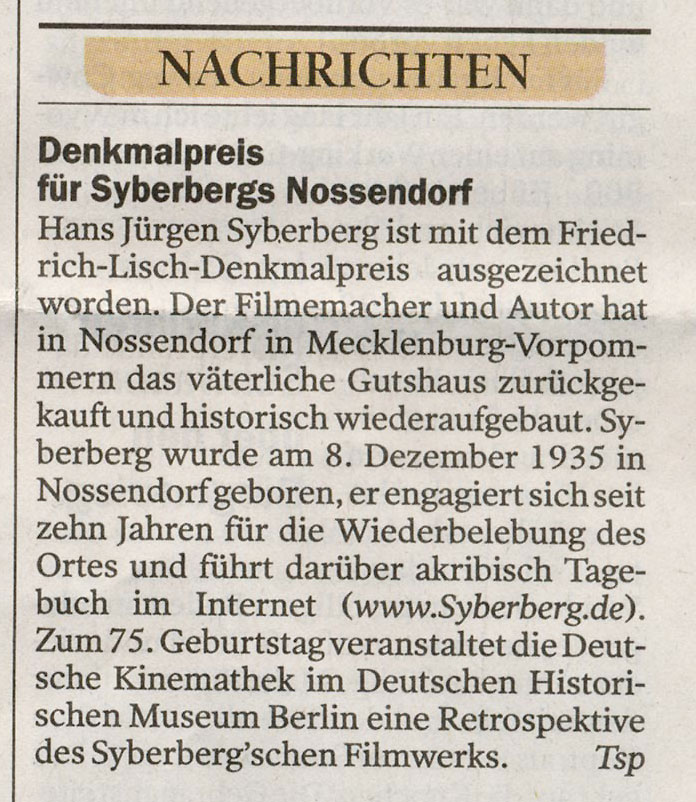 Wie sich von dort, aus Berlin, das Bild darstellt: Syberbergs Nossendorf, in Analogie zu Susan Sontag: Syberbergs' Hitler, die Last aufgreifend, für das Ganze. Den Fluch zu bannen, hier gleich zweifach. Den von von 1945 - und den von 1989/90, als man die Häuser von den Flächen der Felder zu trennen versuchte und deren Bewohner vertrieb. Und die Geschichte Wind und Wetter überliess, die Menschen verwirrend, Kultur vernichtend.
