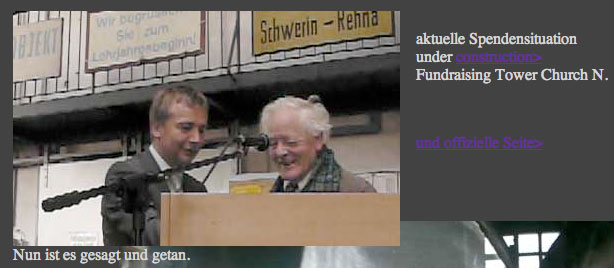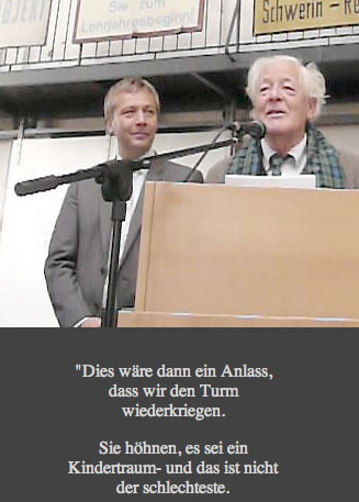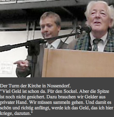 Und was noch zu melden war: Der Preis von 4 500 Euro an den Preisträger wurde nun übergeben an die Wiederherstellung des Turms der Kirche als Teil dieses Nossendorfs, von Haus und Kirche und was dazugehört, das Dorf.