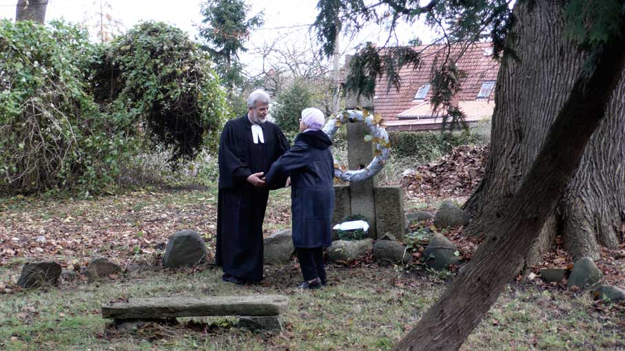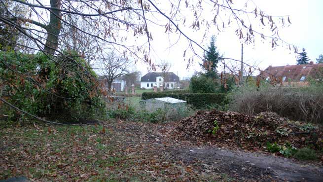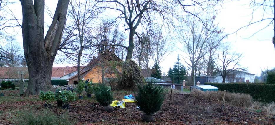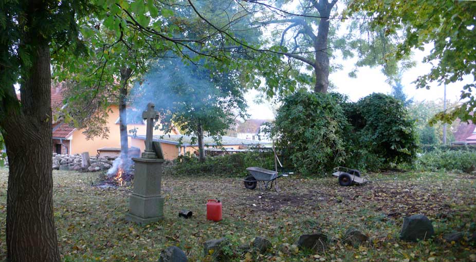 Oft sind nach der Vernichtung der Parks auf den Gütern und den Attacken auf alles was Grün ist und Stein auf Strassen und an Häusern oder als Holz der Alleen die Friedhöfe das Einzige , was als öffentliches Gemeingut noch die historische Struktur der Dörfer belebt. Auch symbiotische Gemeinsamkeiten der Natur, auseinandergerissen, wie alter Hollunder und sich einpassende Reben ergeben zusammen Wunder den Augen und freundlich den Tieren,eins weg alles kaputt. Was bleibt-darüber kann man nur schweigen, mit letzten Rest an Geduld und aufgegebenen Freundlichkeiten. Doch wer will hier liegen, wenn es laut wird den Augen unerträglich vor dem eigen Haus. Gotteacker sagten sie früher-heute gilt die "Rede des toten Christus vom Weltgebäude herab, dass kein Gott sei"...