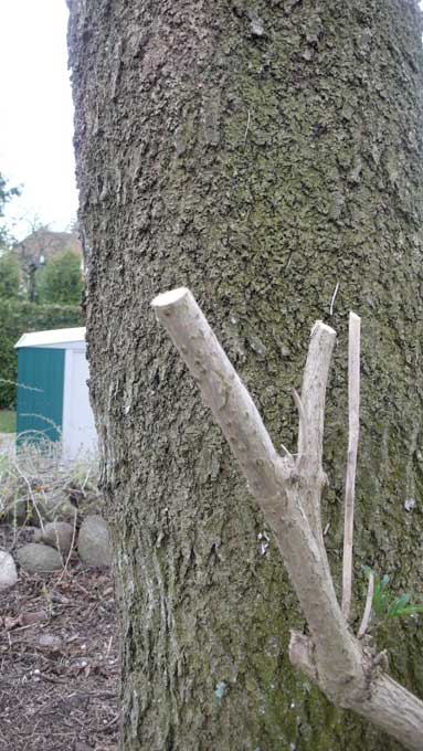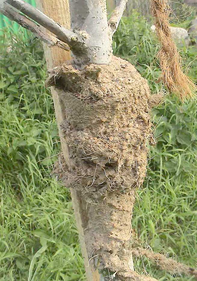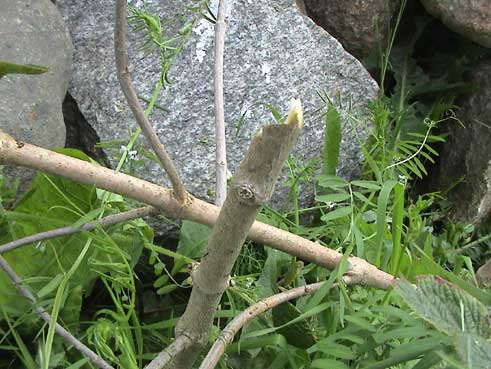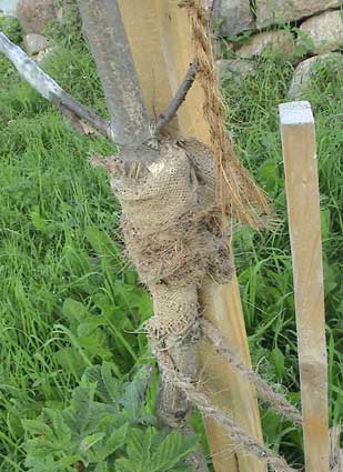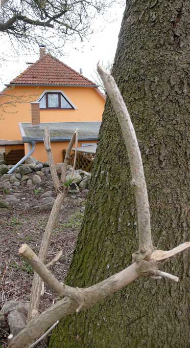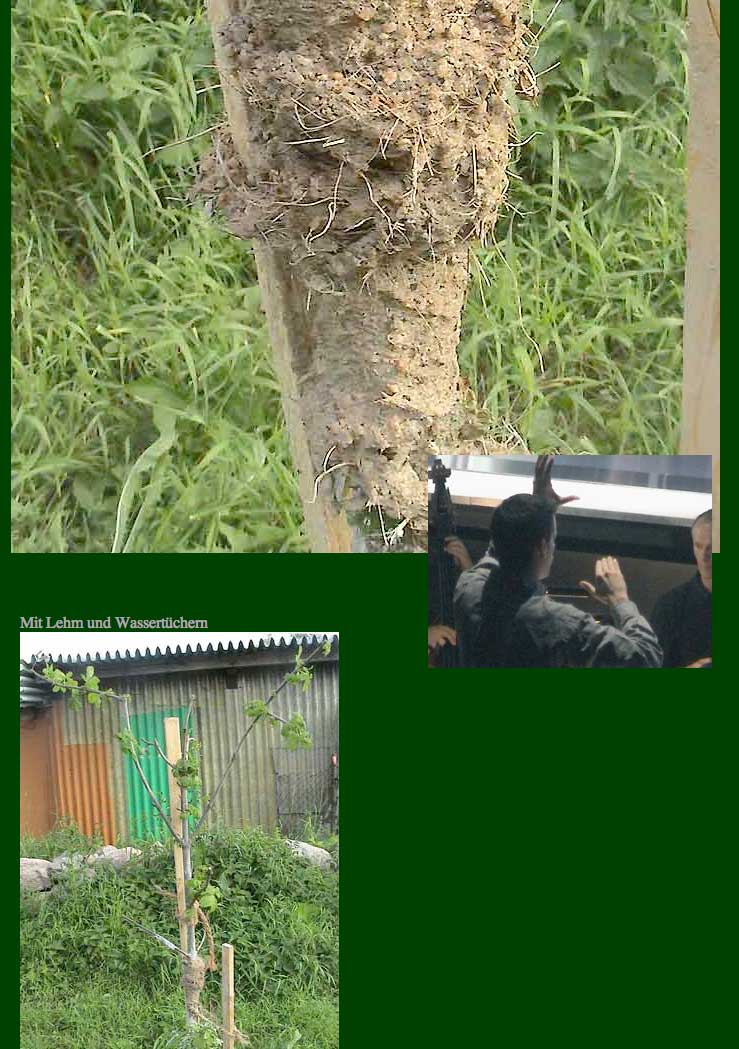 Die gebrochene Kastanie wieder hochgebogen und verbunden mit Lehmwickeln täglich gegossener Verband. Wie ein Knochen umsorgt.
