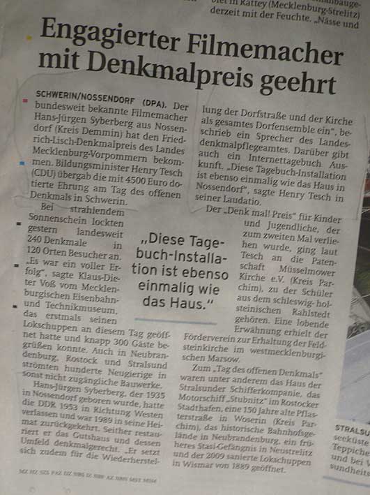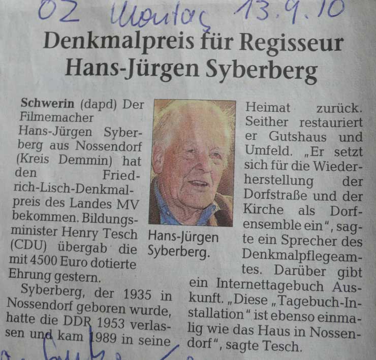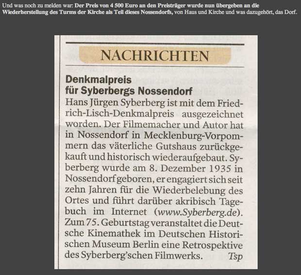 Danach begann mit gehöriger Zeit jenes Projekt Nossendorf. Zu entwerfen, mehr war und ist nicht da, was war anzunehmen und zu erkennen wozu, auch wie wir die Zeit genutzt haben, daraus das Heutige zu tun, wie schon immer diese Häuser und Güter die Stätten waren des jeweils Heutigen der Zeiten als Kosmos des Lebens, der zu formen war, und als sie diese Form verloren, war es auch mit ihnen vorbei.