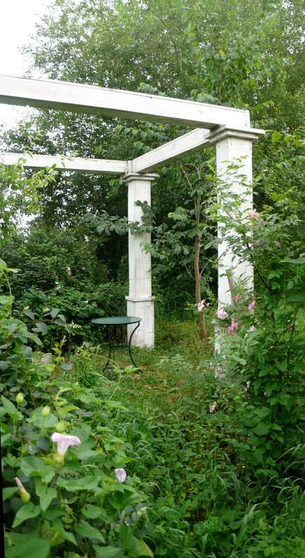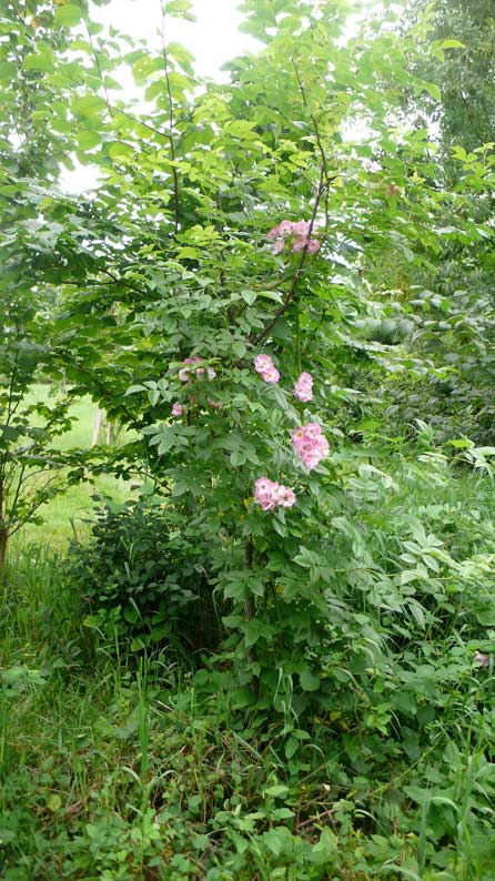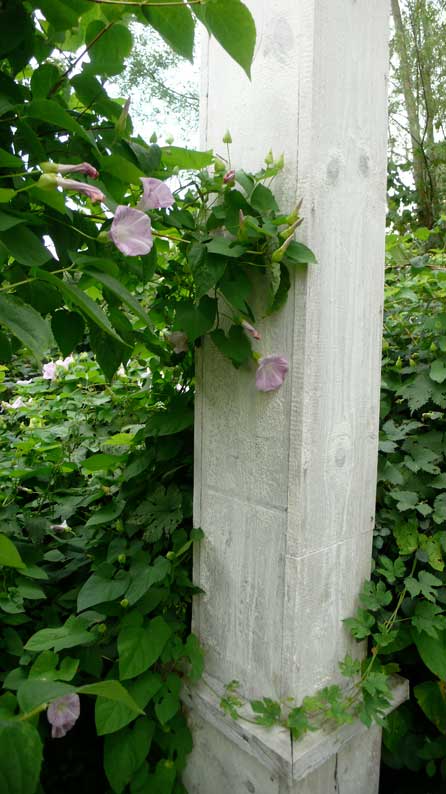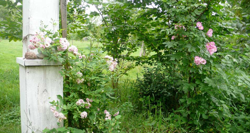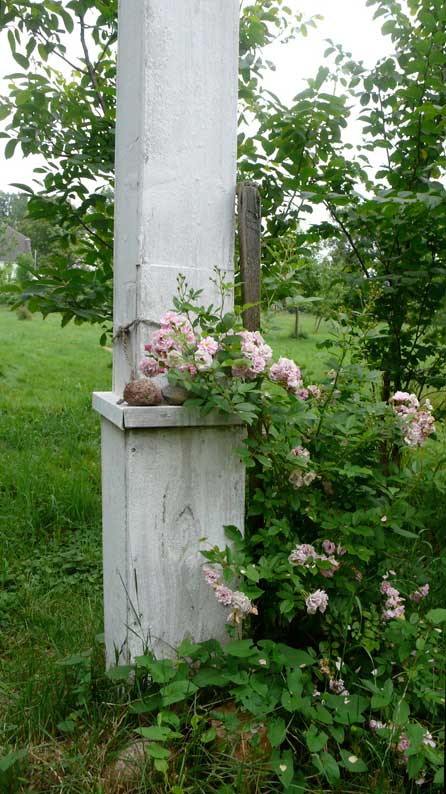 Die hier an den Pfeilern angeseiedelten Rosen tragen zum ersten mal ihre Blüten.