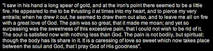 "Hier aber wollte der Herr, dass ich den Engel in leiblicher Gestalt sehen sollte. Er war nicht groß, eher klein, aber sehr schön. Sein Antlitz war so entflammt, dass er mir als einer der erhabensten Engel vorkam, die ganz in Flammen zu stehen scheinen. Es müssen dies jene sein, die man Cherubim nennt. Sie sagen mir zwar ihre Namen nicht, aber ich sehe gut, dass im Himmel zwischen den einen und anderen Engeln ein unaussprechlicher Unterschied ist. In den Händen des mir erschienenen Engels sah ich einen langen goldenen Pfeil; an der Spitze seines Eisens schien mir Feuer zu sein; es kam mir vor, als durchbohrte er mit dem Pfeil einige Male mein Herz bis ins Innerste, und wenn er den Pfeil wieder herauszog, war mir, als zöge er den innersten Teil meines Herzens mit heraus. Als er mich dann verließ, war ich ganz entzündet von feuriger Gottesliebe. Der Schmerz war so scharf, dass er mich zu vielen Seufzern trieb, und so groß war die Süßigkeit dieser Qual, dass ich niemals wünschen kann, sie zu verlieren, noch dass meine Seele mit weniger als Gott zufrieden sei. Es ist kein körperlicher Schmerz, sondern ein geistiger, obwohl der Körper Anteil daran hat, großen Anteil. Der Liebesverkehr, der seither zwischen meiner Seele und Gott stattfindet, ist so beglückend, dass ich den gütigen Herrn anflehe, er wolle ihn dem zu kosten geben, der etwa meint, ich würde hier lügen"