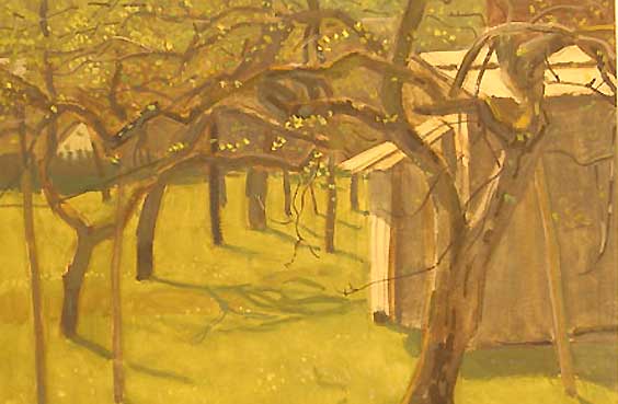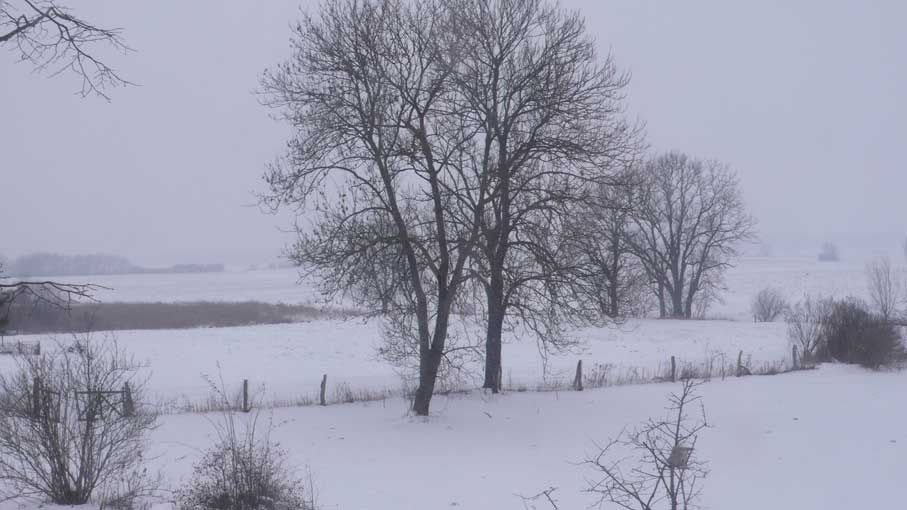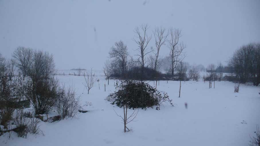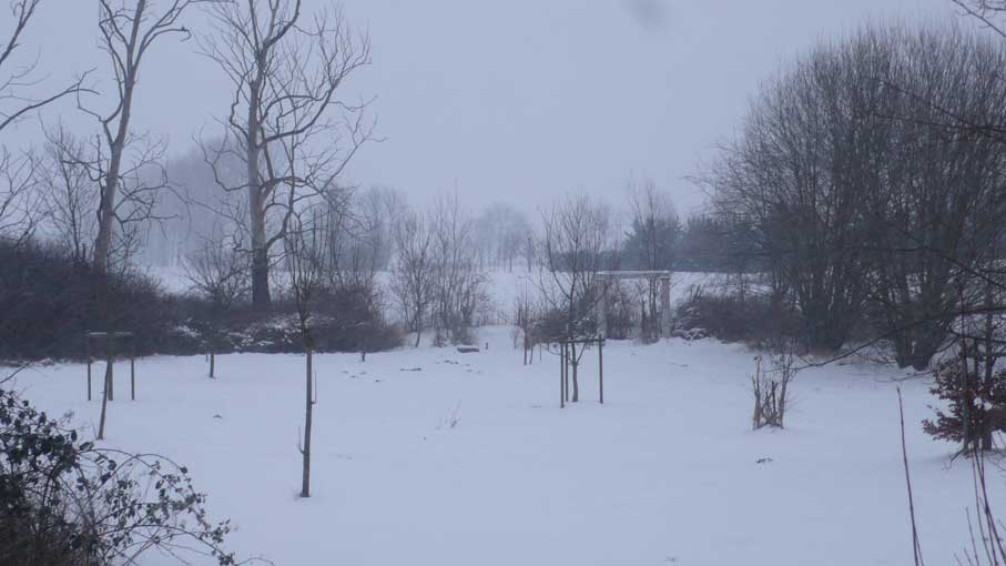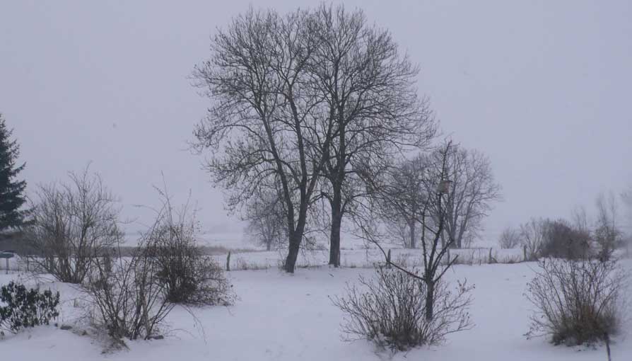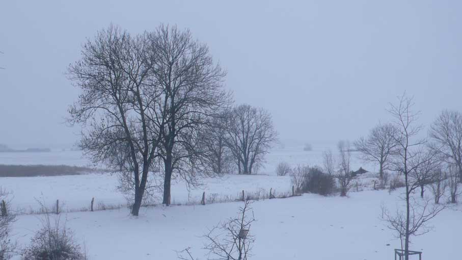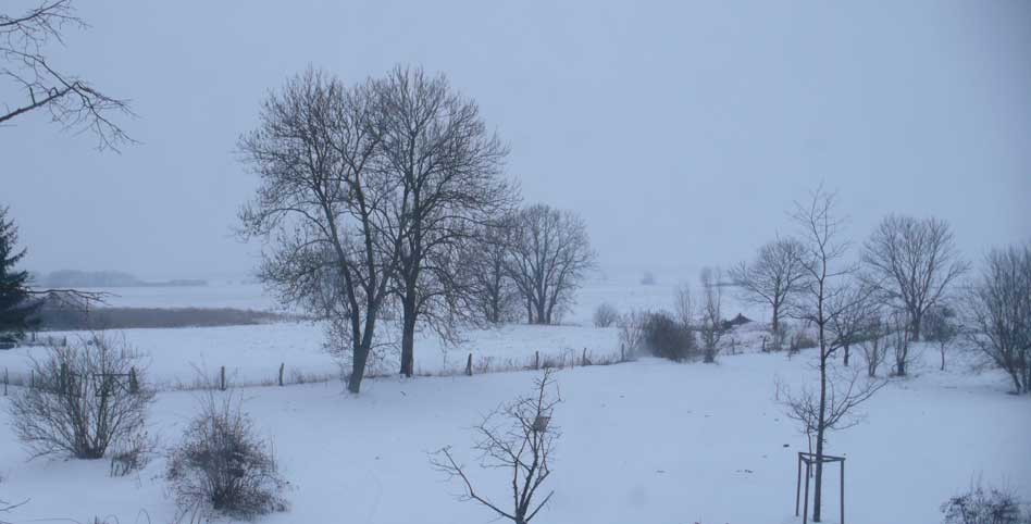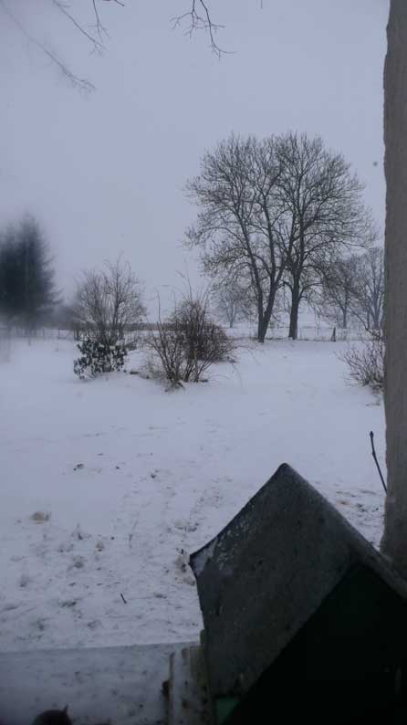 Heute zurückgekommen, von wo es ausging. Wachend in eisiger Zeit schattenloser Äste, Sträucher, Bäume und klirrender Felder und Wiesen, wo einst ein Park war und lebende Tiere rundum, aus Fenstern wieder geschaut wie einst. Vereist auch sie. Sie aber sie, die da gegrüsst aus solchen Wäldern am See, und geführt über die Wiesen der Berge, ist verloren die Wolke nun über dem Pflaumenbaum des Herren seiner frühen Tage, von dem er ihr erzählt, was sie schaudernd nicht verstand. Und so macht Erinnerung hier aus dem Flammerschwert des väterlichen Vertreibers aus dem Paradies seinen Zeichenstift und Pinsel und aus den Bildern seines Lebens die Chronik des Paradieses der Vertriebenen selbst. Zurückgebracht an den Ort der Herkunft