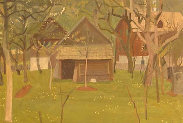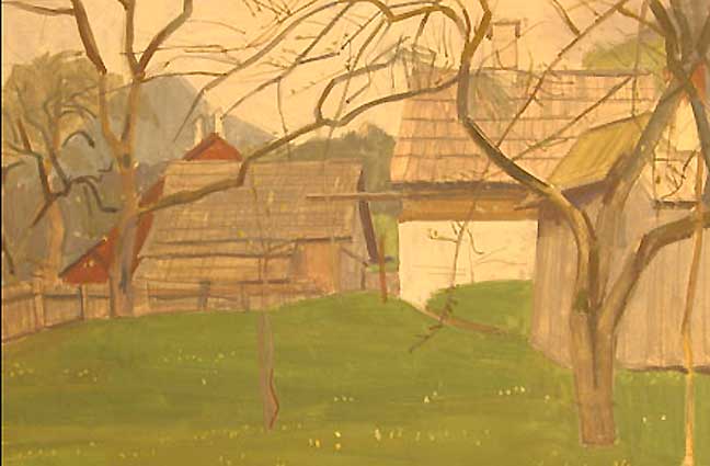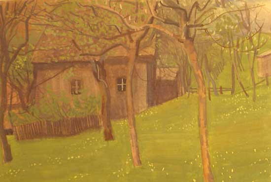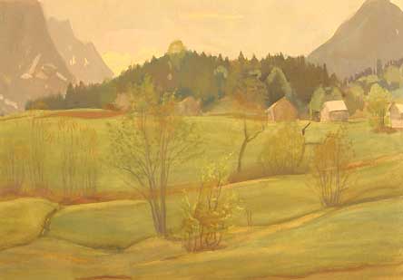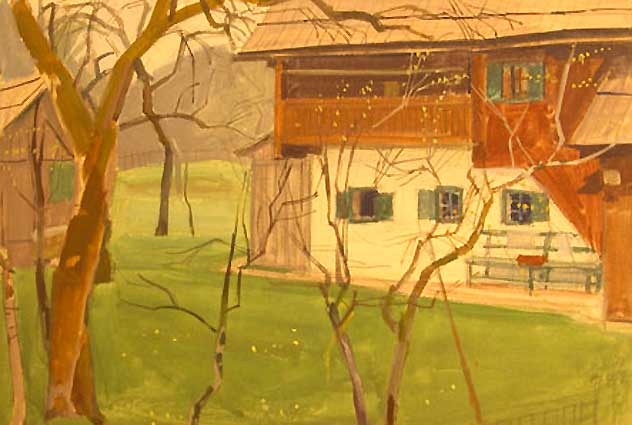 ..an den See der österreichischen Berge dieser Hütten aus Holz und grünen Wiesen in der Hand jenes Karl Hauk aquarelliert damals gerade so entstanden nach dem Krieg, auch er dorthin geflohen, ein heiteres Land. Aus seiner Not mit Frau und Kind ihm und ihr diese Bilder dieses Kindes Landschaft.