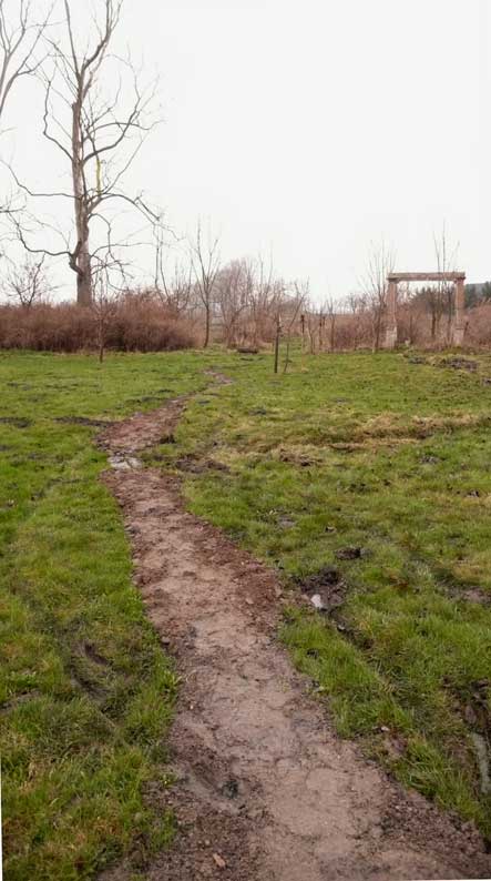 Das Problem was zu lösen war. Wie kommen wir trockenen Fusses vom Haus an den anderen Ort unten, zum Sitzplatz, wo früher der Graben, das Wasser abführte. Das kann aufwendig sein oder so, dass es nicht wehtut. Dem Geldbeutel und dem Auge. Das Schicksal des Marienhains