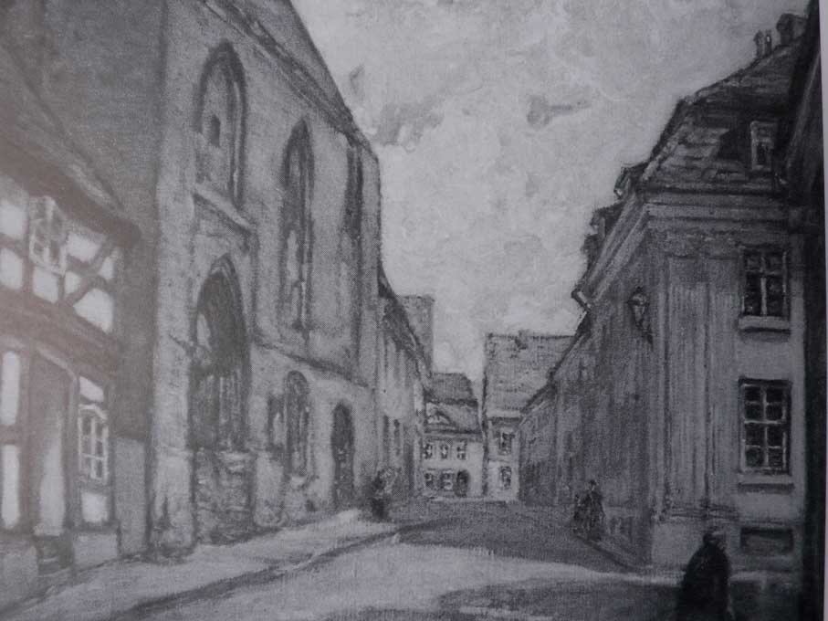 in Richtung Altar und frühere Absis. Also neben dem Garten und Haus des Freundes (links), wie früher geglaubt.