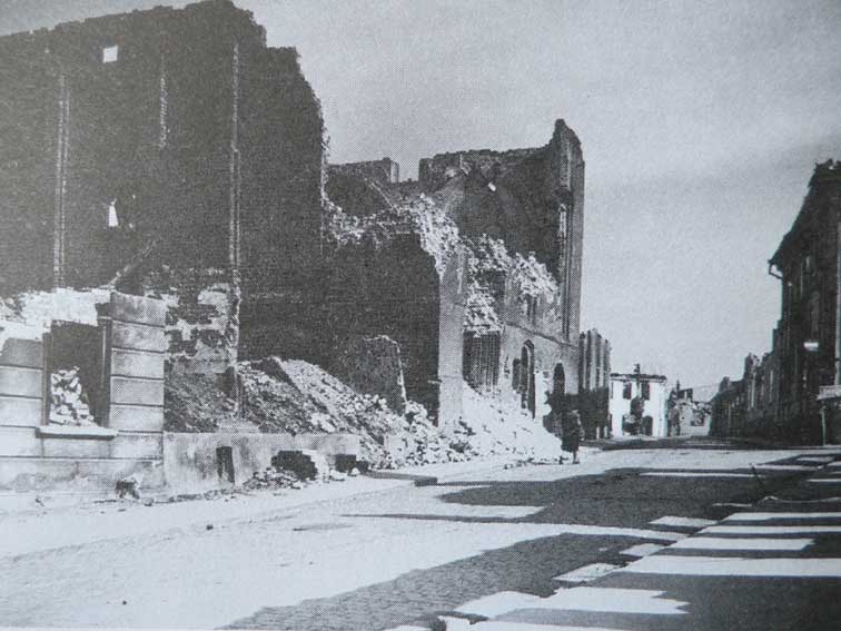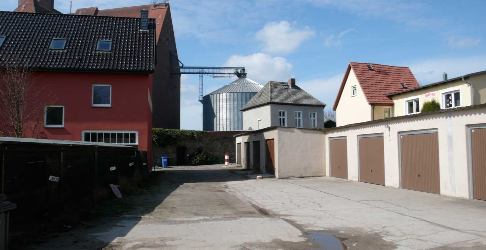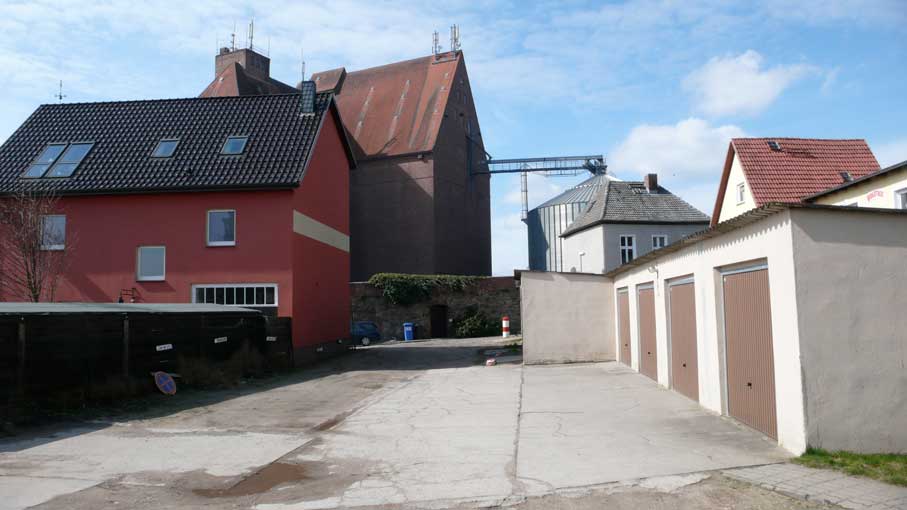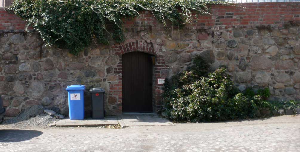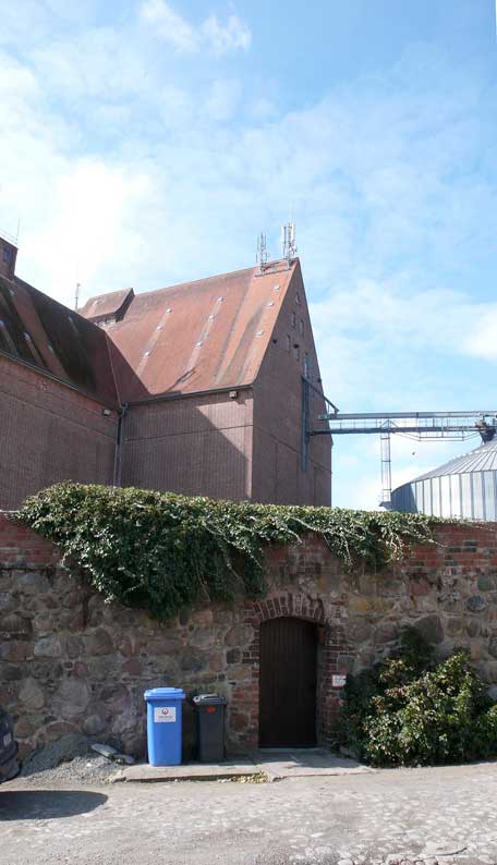 Solche Mauern und Steine als Rest erhalten in der Strasse an der Absis, dahinter die noch massiven Speicher bis 1940 so gebaut(Getreidehändler Kleenhammer) an der Peene /Hafen.