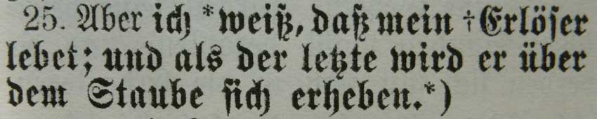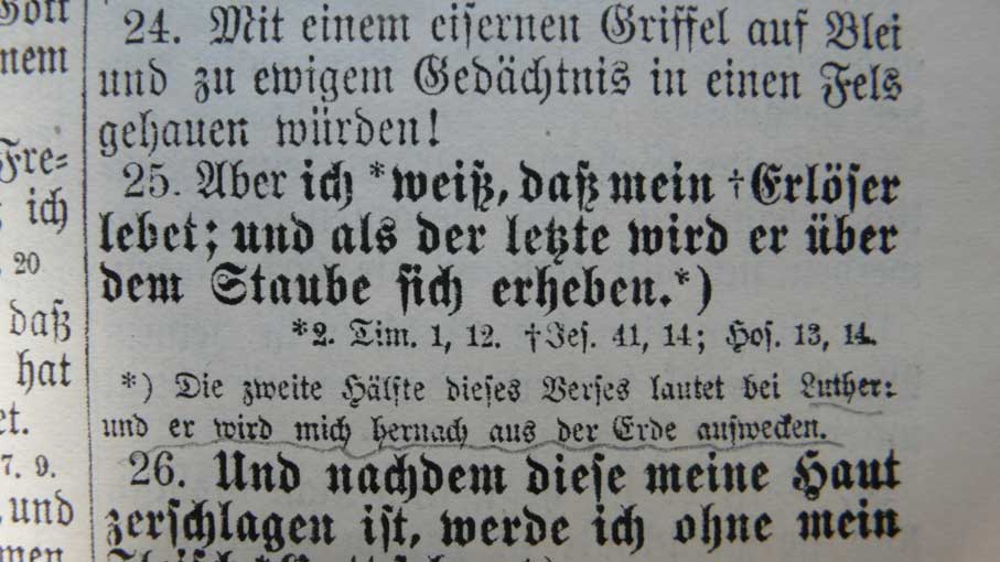 Doch ich weiss: mein Erlöser lebt und als der Letzte wird er über dem Staub stehen.
