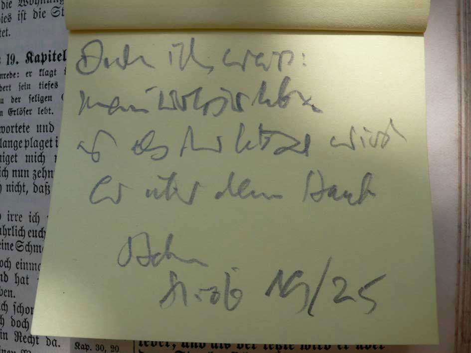 Auf der Anzeige in der Rhein- Neckar- Zeitung für die Beerdigung steht das Hiob-Zitat in der hier handschriftlichen Version durch das telefon gegeben. In der Haus-Bibel hier von 1908 wird die Luthersche Version klein als Fussnote beigegeben. Alle 3 Versionen unterscheiden sich nicht nur durch Worte, sondern auch in der Bedeutung.