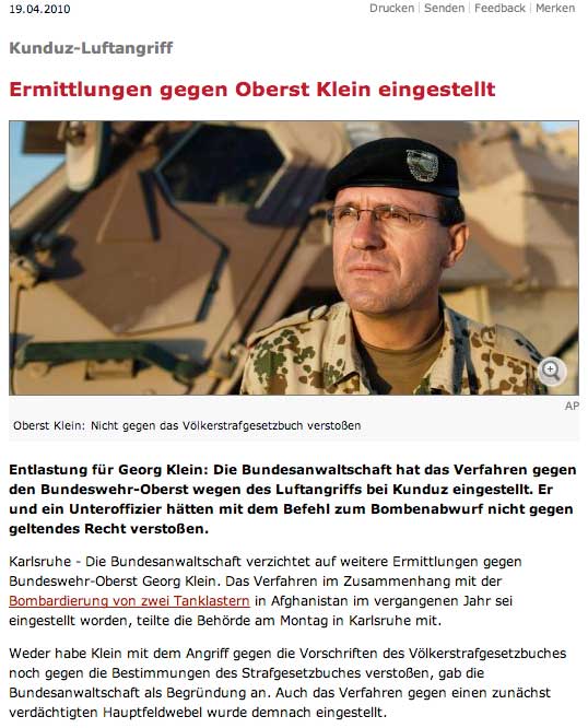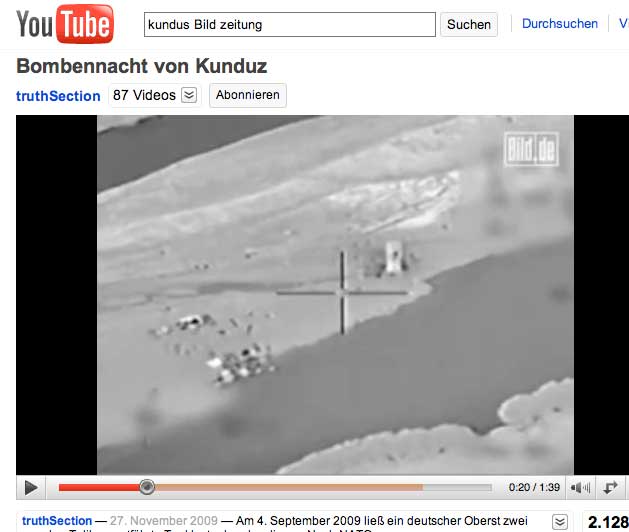 Krieg? das hätten sie gerne. Um umbringen zu können, nach ihren Geseetzen, die Okkupanten des Überfalls, in einem Auslöschungsfeldzug der westlichen Wertegesellschaft. Wo aber sind die Panzer und Flugzeuge der Eingeborenen, wo die Schlachten und Fronten, dass es ein Krieg ist. Was anders als Forts, wo sie sich verstecken und jammern. Dass keiner sie liebt, nicht mal die eigenen Leute zuhaus. Schämen sollten sich unsere Politiker von Totenfeier zu Totenfeier die Kranzlerin der Staatsraison. Truth section heisst das Dokument des Tötens ohne Not. Und wir sind dabei.