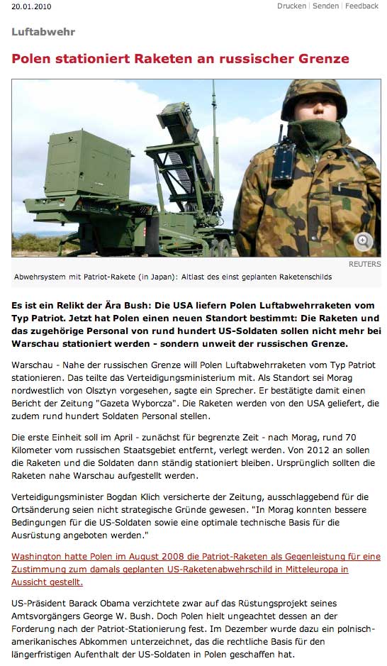 US-Präsident Barack Obama verzichtete zwar auf das Rüstungsprojekt seines Amtsvorgängers George W. Bush. Doch Polen hielt ungeachtet dessen an der Forderung nach der Patriot-Stationierung fest. Im Dezember wurde dazu ein polnisch-amerikanisches Abkommen unterzeichnet, das die rechtliche Basis für den längerfristigen Aufenthalt der US-Soldaten in Polen geschaffen hat.
