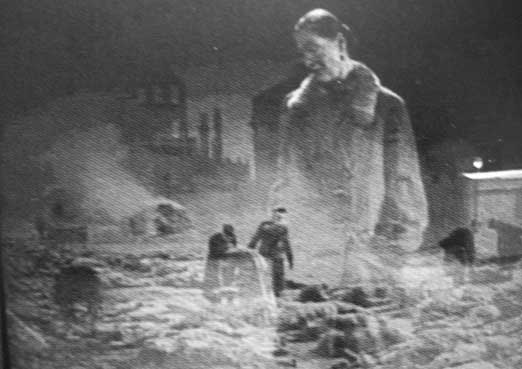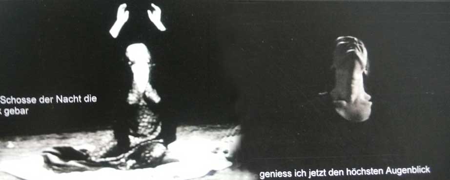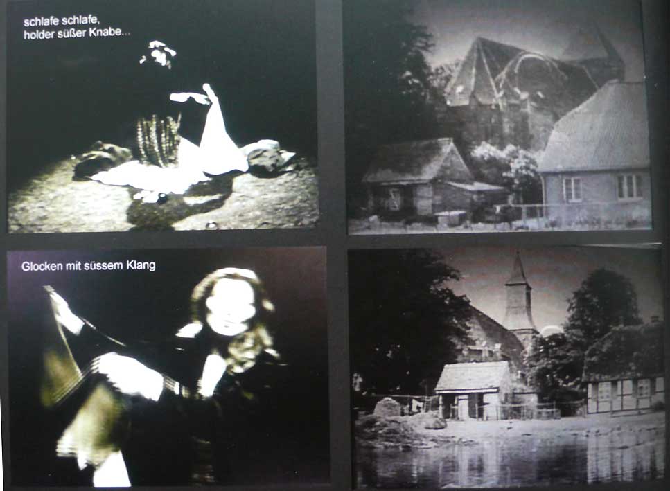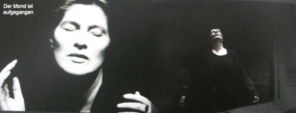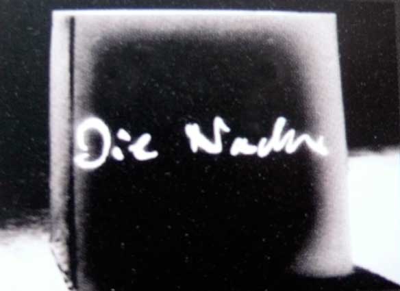 Auf der einen Seite das Entsetzen der Nachrichten von 1945 ("Aachen existiert nicht mehr--" Aus dem Radio und die Einschläge der Bomben - auf der anderen Seite das: "nacht, es ist Nacht..." beides von derselben Stimme und dann kommen die nächtlichen Worte :