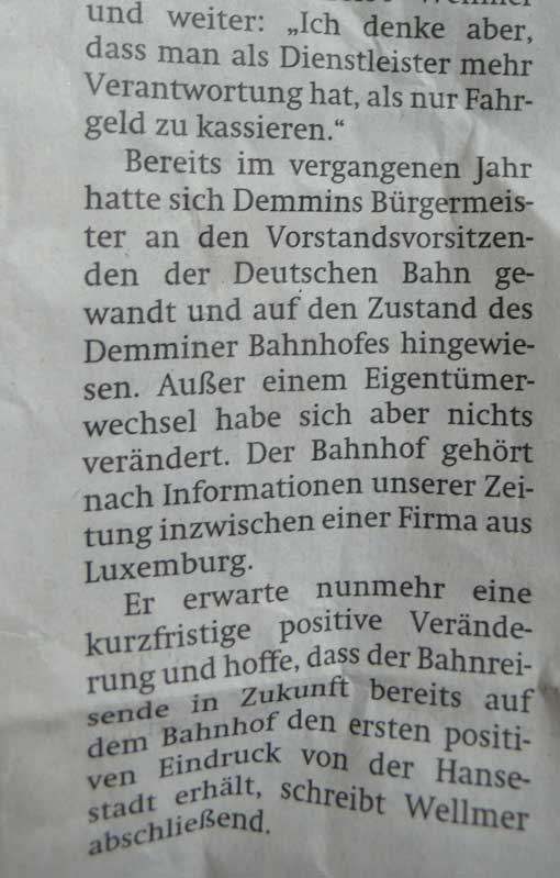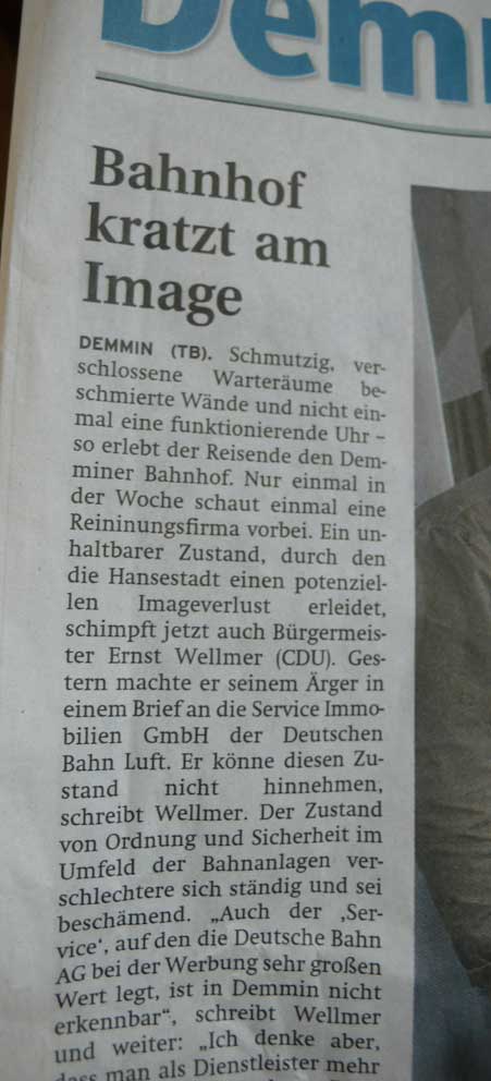 Und man tue nicht, als sei das eine Ausnahme Demmin(Kreisstadt!). Die ganze Strecke von Berlin nach Stralsund alle Bahnhöfe sind schlimmer als in der DDR in einem Zustand, dass nach Verantwortung zu fragen ist.