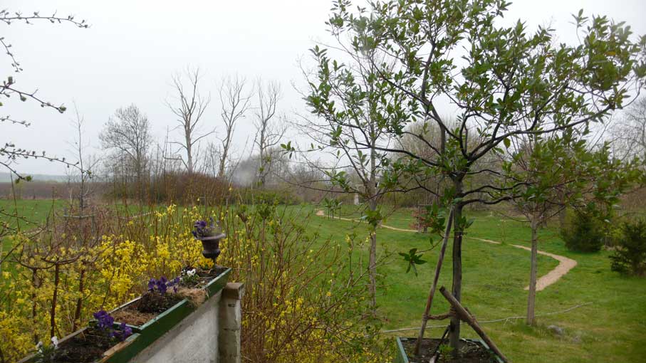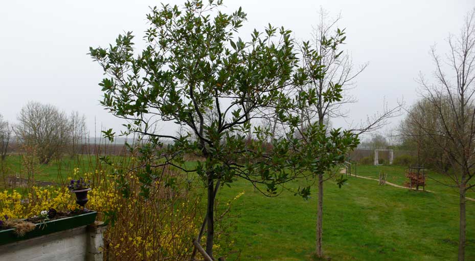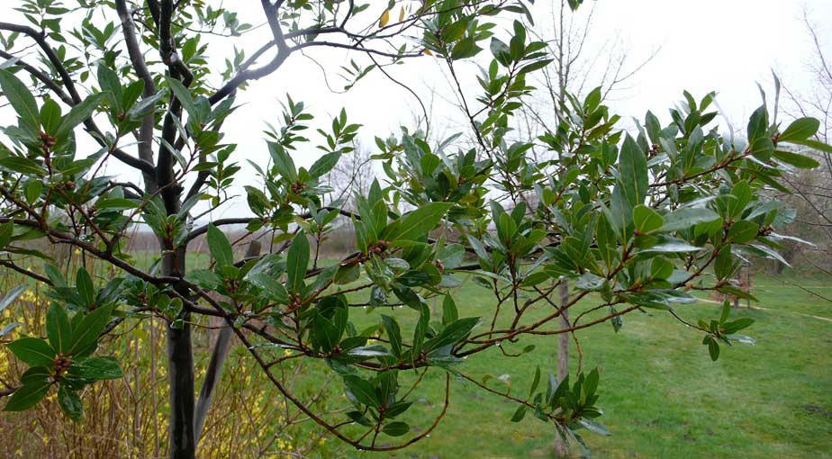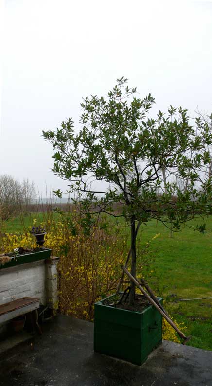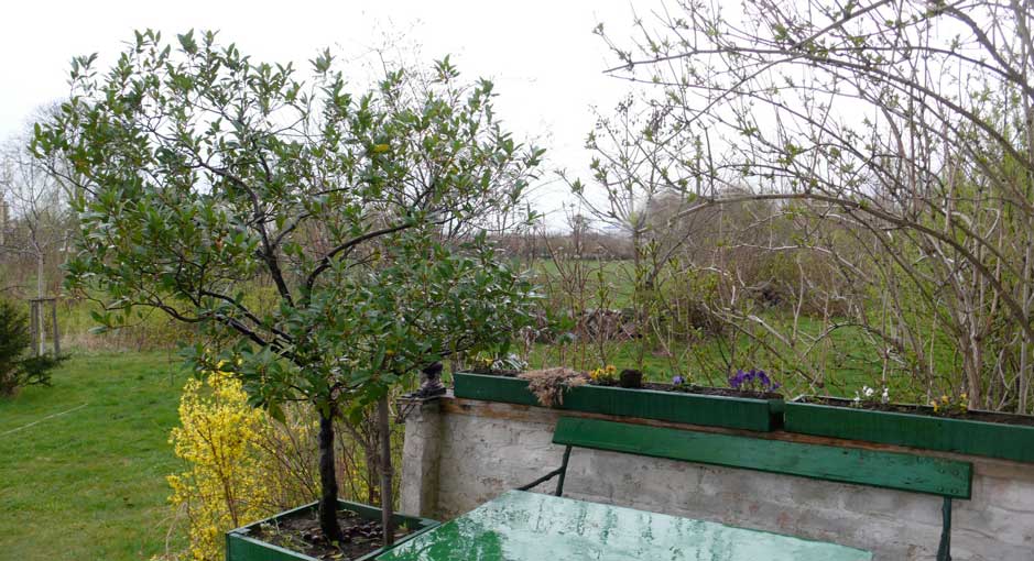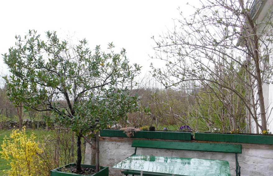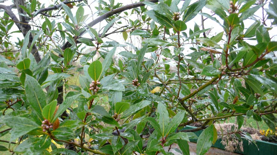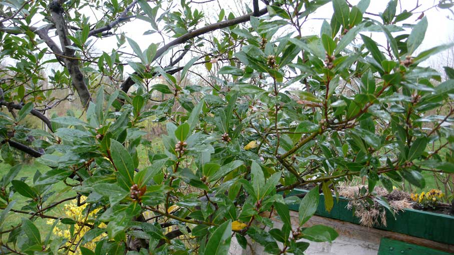 Endlich sind sie wieder raus. Die Lorbeerbäume. Und gleich mit Regen. So lange nicht mehr das Nass auf den Blättern, wie oft auch gegossen und durch die Kälte gebracht.