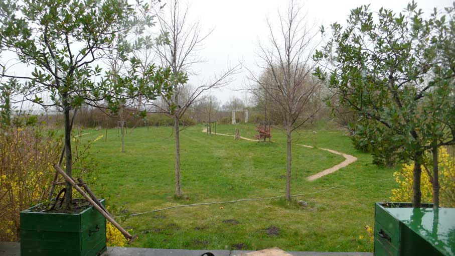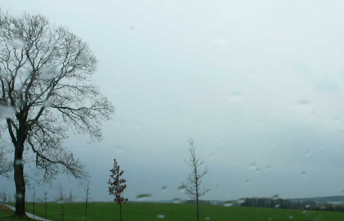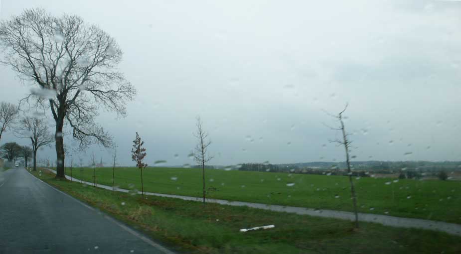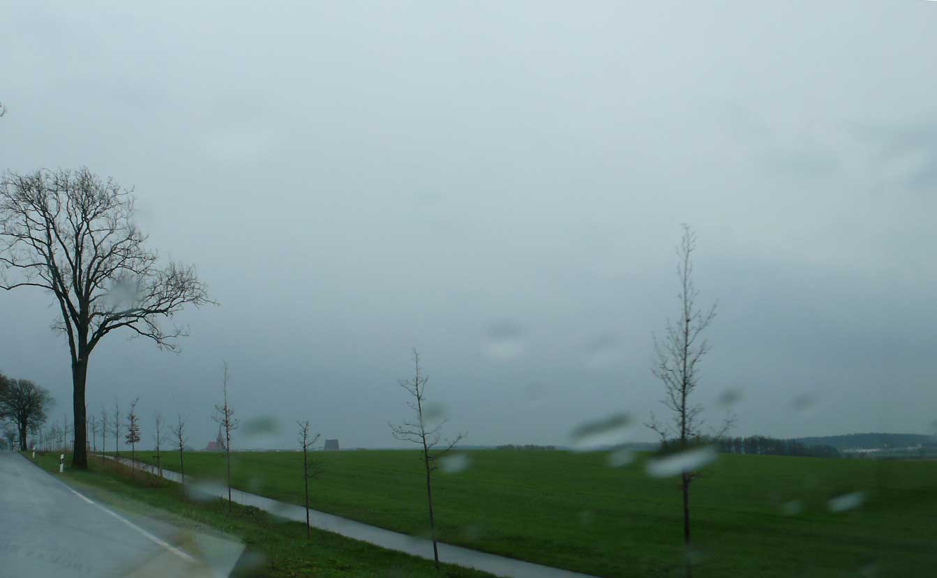 Auf der Fahrt nach demmin über den Wiesen der Turm von St. von Stüler C.D.Friedrich nachgemacht in Greifswald? rechts die Senke der Trebel.