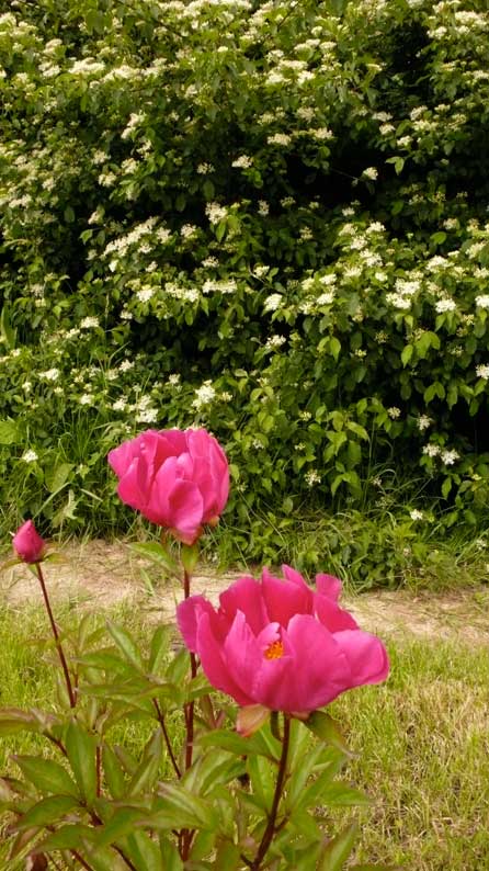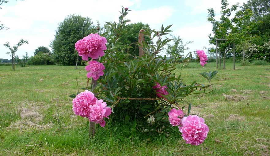 Auch die Pfuingsrosen spät, aber vor der ländlichen Kulisse wieder.