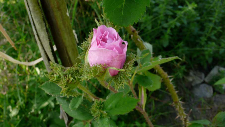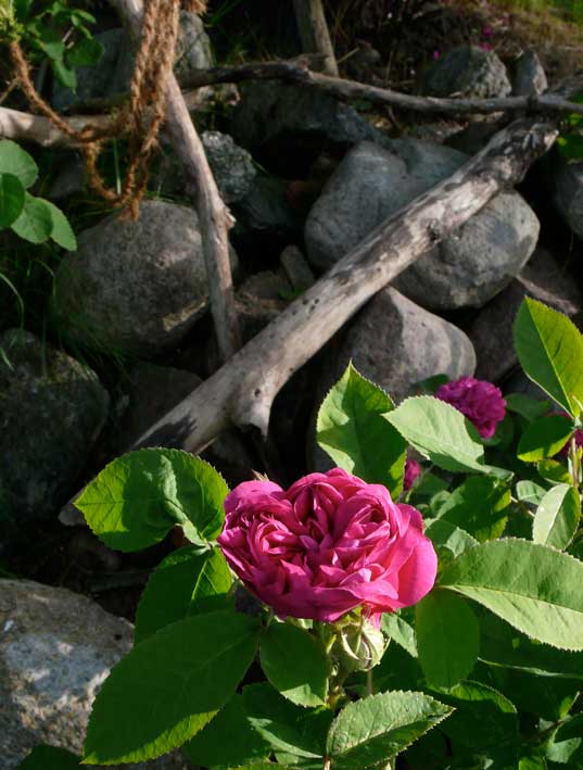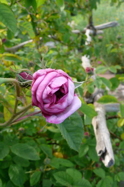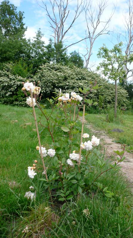 Rose de la Feligonde eben gepflanzt dankt schon vor den Sträuchern des ehemaligen Grabens