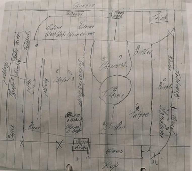 Manfreds Plan nach der Erinnerung, wie meine. Links der Garten und die Wege, rechts der Park. Manfreds letzte Tat, des Ehlerts von den Kühen. Wusste noch viel. Gisela, die Frau und eine der unseren in der Klasse, nun auch schon nicht mehr da.
