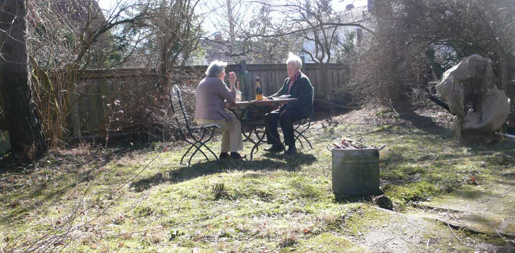 Wo der Graben war, an der Grenze zu den Feldern, gabs noch einen Weg parallel, hinter den Himbeern, wo die jungen Mädchen in der Sonne kicherten und sich bedeckten, wenn der Vater kam, von hier nach dort, nun Himmelswolken und Zaun. Damals die schönste Zeit, mit 15 Jahren, sagte die heutige Grossmutter Erna aus dem Mädchenzimmer neben, in der Küche wieder mit der Tochter-Mutter an ihrer Seite und lacht.