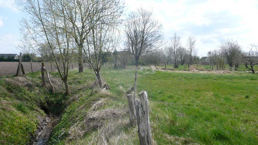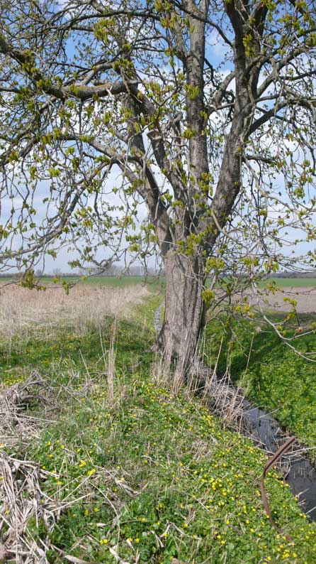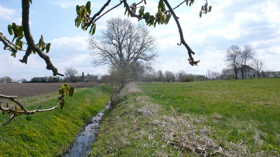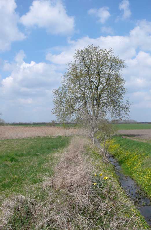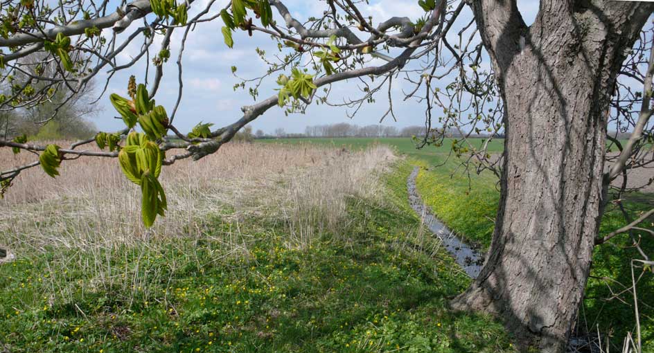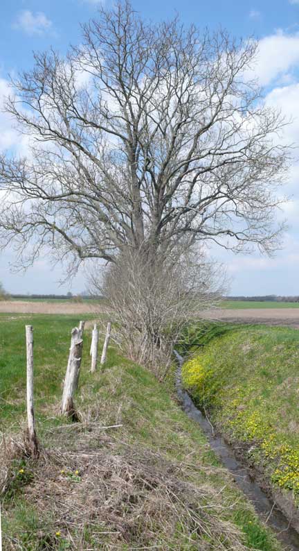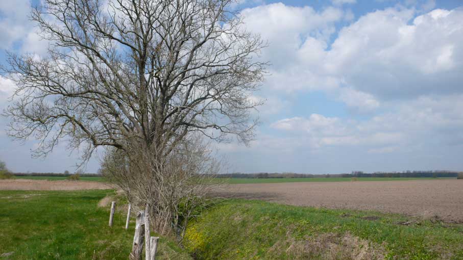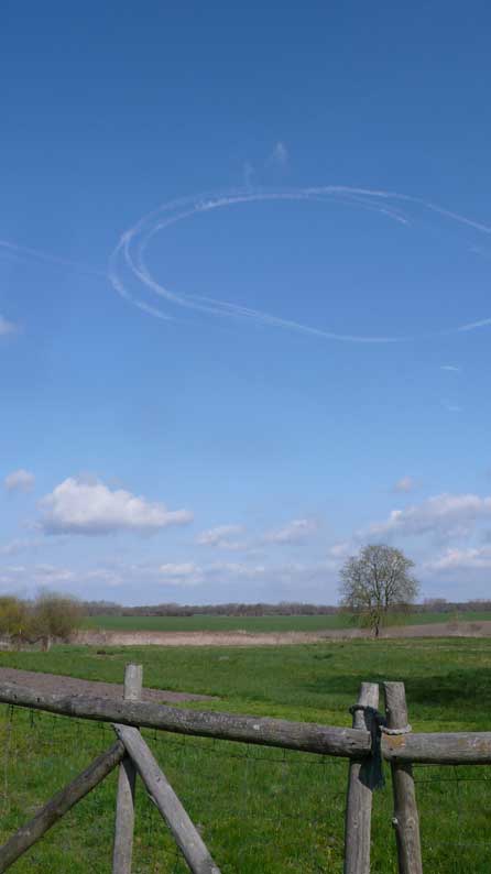 über die Felder, dass nichts mehr zufliesst, nur noch durch, wie versteckt, und links und rechts ohne Bäume, dass nichts reinwächst, eine Schneise des Nichts, wo früher Leben war, für Tiere und Menschenkinder, Hollunder und Flieder.