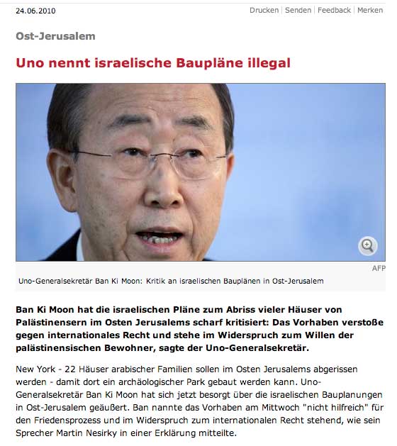 Die fortgeschrittenen Planungen der Jerusalemer Stadtverwaltung fŸr einen archŠologischen Park und den Ausbau von Siedlungen im Viertel Silwan im arabischen Osten Jerusalems seien Besorgnis erregend. Der Uno-GeneralsekretŠr erinnere die israelische Regierung an ihre "Verantwortung", keine Schritte zu unternehmen, die "die Spannungen in der Stadt verschŠrfen" kšnnten.
