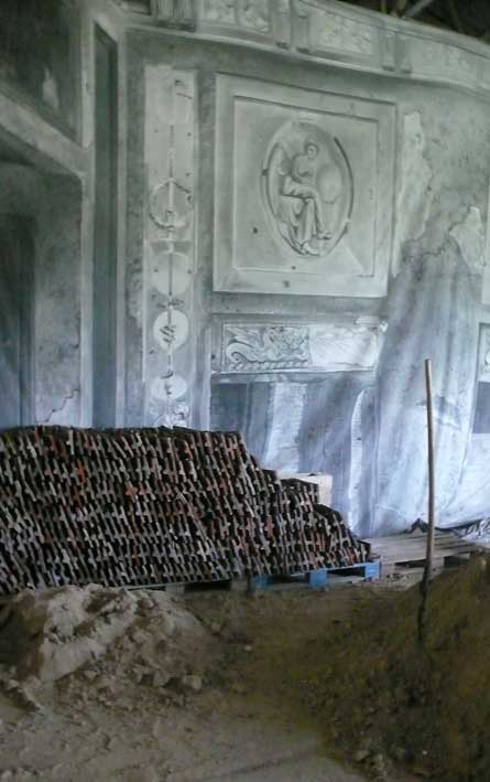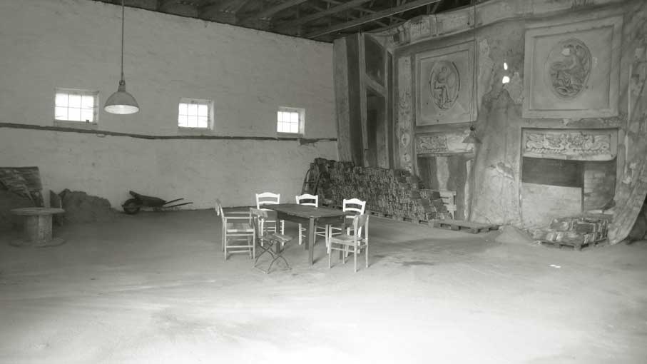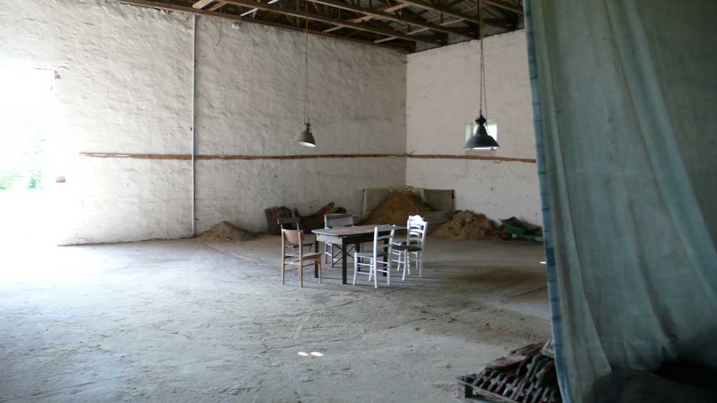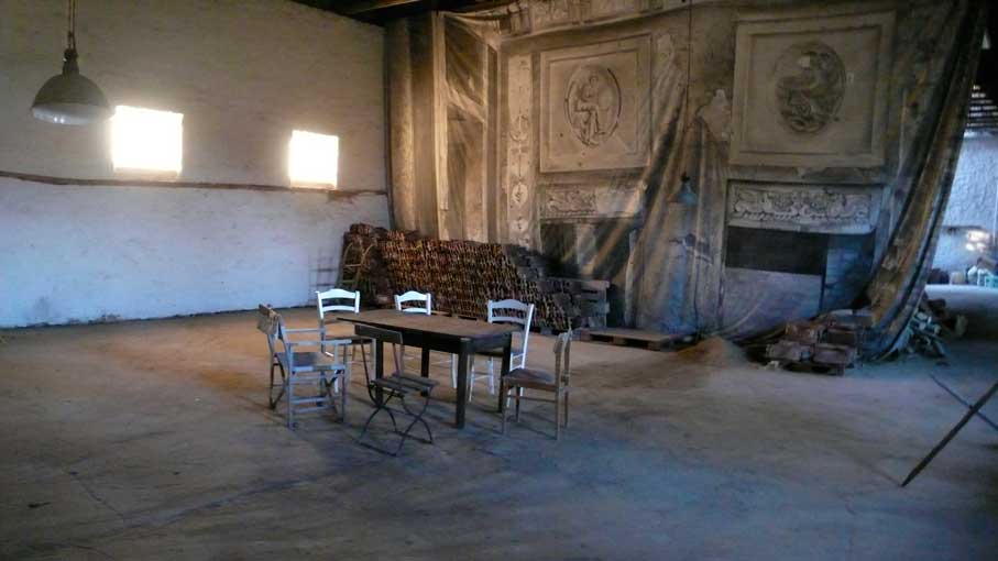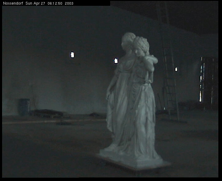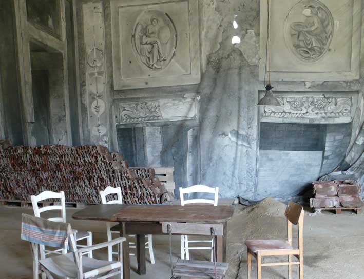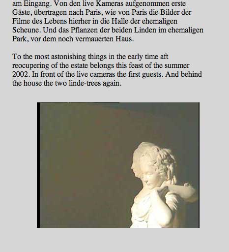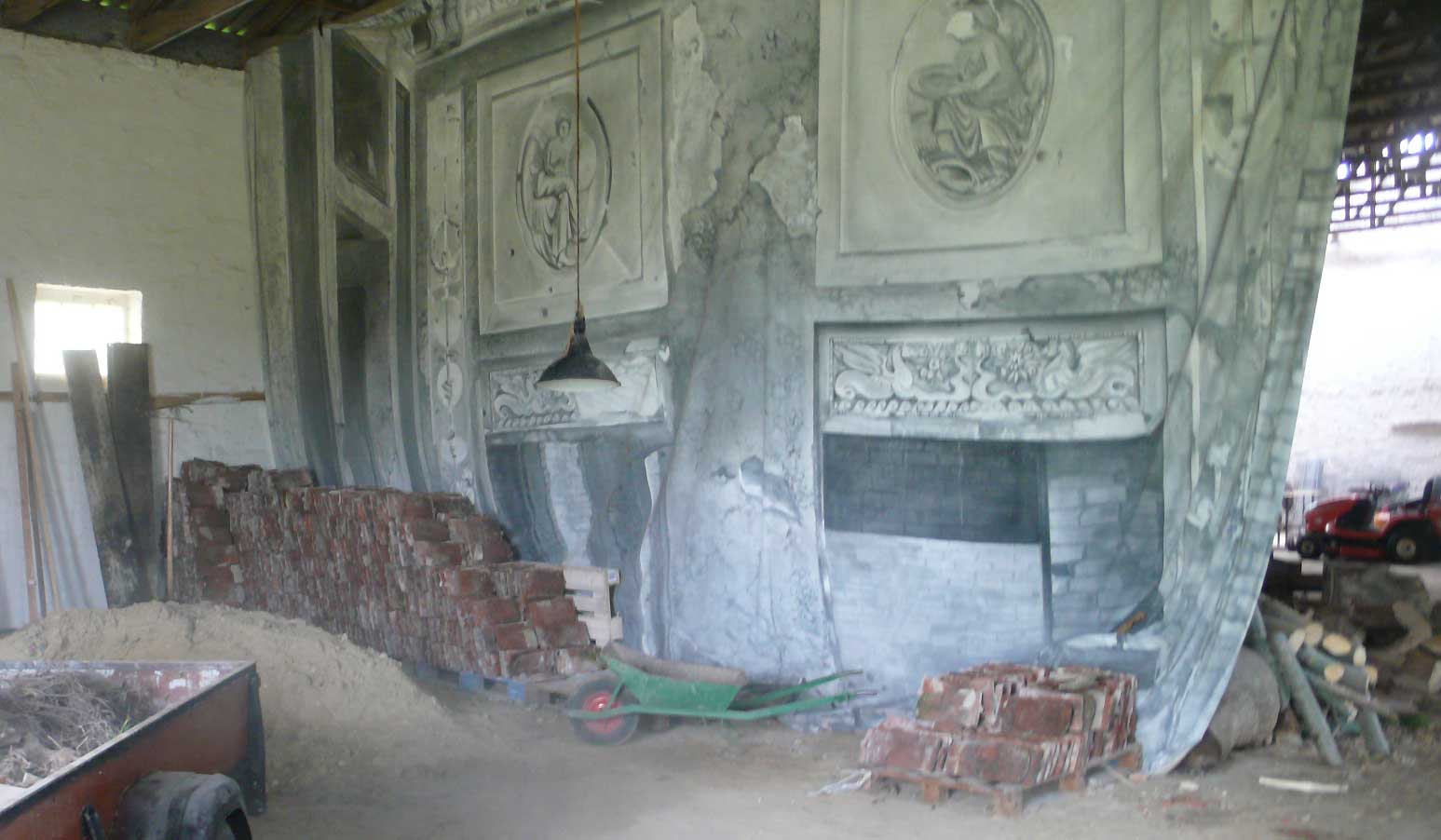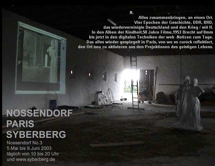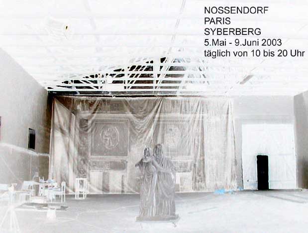 Es zeigt in der alten LPG Halle von Nossendorf in Pommern an der Stelle der alten Scheune die letzten Reste des Berliner Schlosses als Ruine(Parolezimmer) wo die Prinzessinnen standen von Schadow/Luise und Friederike) aus der Marquise von O./Kleist -die Geschichte einer Vergewaltigung zur Kunst geworden- im Film von HJSyberberg und Edith Clever. Nun als letztes Aufgebot dessen, was uns blieb. Als sleeping beauty unserer Musik, Kammer der Musik. Wie nie gewesen.
