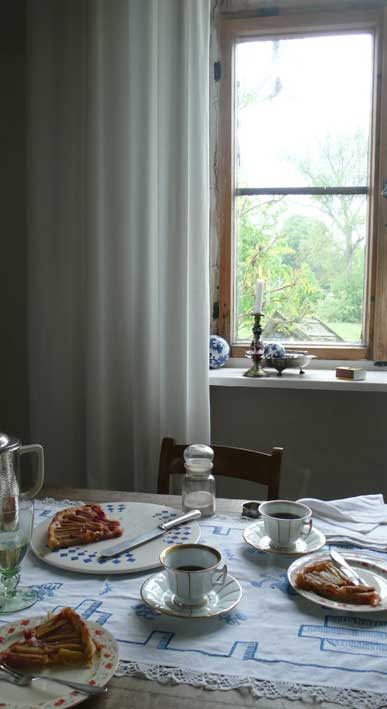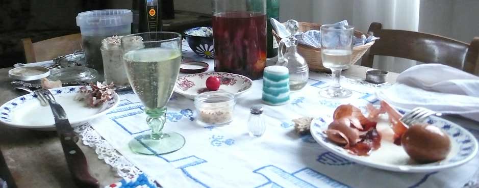 zuerst die Soleier, Salzgurken, Schmalz der Kräuterquark und dann der Rhabarberkuchen mit alter Kanne aus N. vor 45.