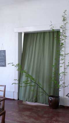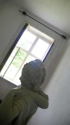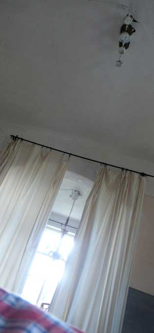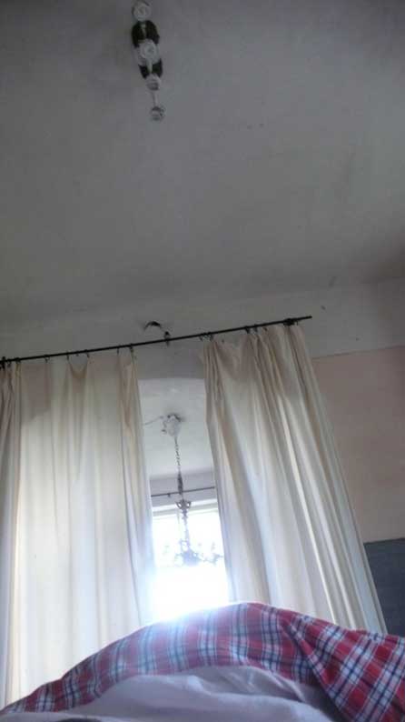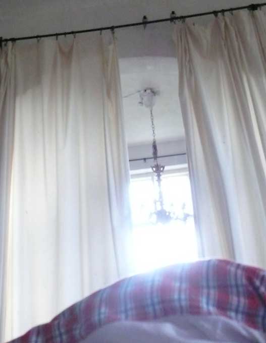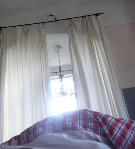 Dort wo sie durchkommen, nachdem die Türen und Fenster geschlossen sind, vom offenen Kamerafenster, muss der Vorhang die Figuren verschliessen