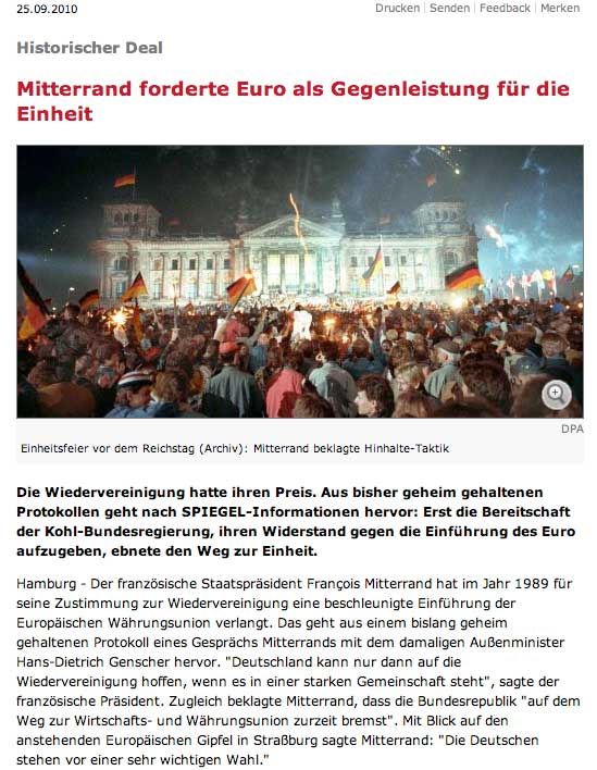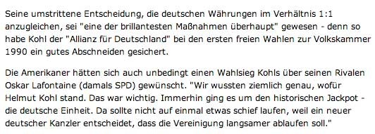 In den Vorabmeldungen zum heutigen SPIEGEL zum Thema Geheimakten zu Deutschlands Einheit vor 20 Jahren lesen wir von den Forderungen der verschiedenen Seiten.