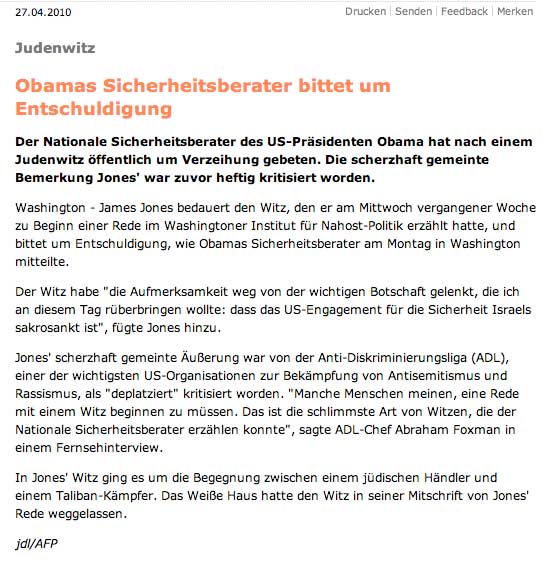 Jones' scherzhaft gemeinte Äußerung war von der Anti-Diskriminierungsliga (ADL), einer der wichtigsten US-Organisationen zur Bekämpfung von Antisemitismus und Rassismus, als "deplatziert" kritisiert worden. "Manche Menschen meinen, eine Rede mit einem Witz beginnen zu müssen. Das ist die schlimmste Art von Witzen, die der Nationale Sicherheitsberater erzählen konnte", sagte ADL-Chef Abraham Foxman in einem Fernsehinterview.