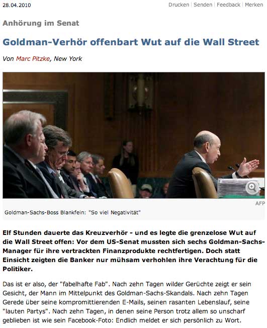 So oder so, die fast elfstŸndige Marathon-Inquisition offenbarte die Vertrauens- und Imagekrise der Wall Street: Ihr grš§tes Talent ist plštzlich zu ihrem grš§ten PR-Problem geworden - die Kunst, so viel Geld wie mšglich zu scheffeln, mit welchen Mitteln auch immer.