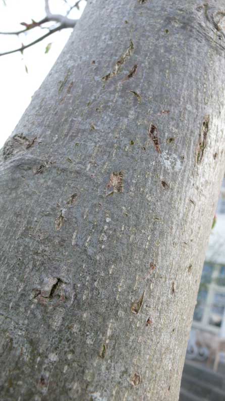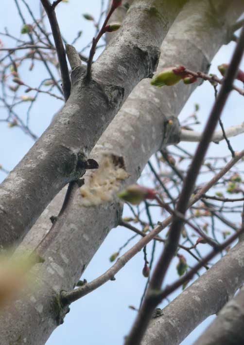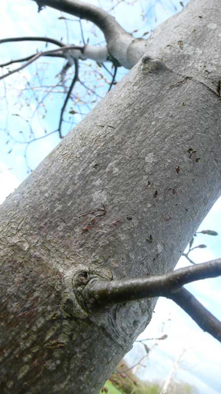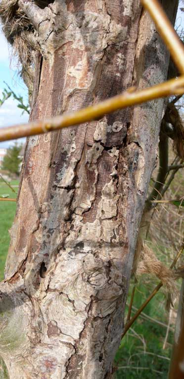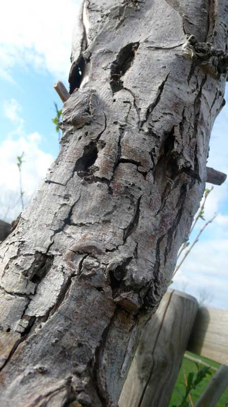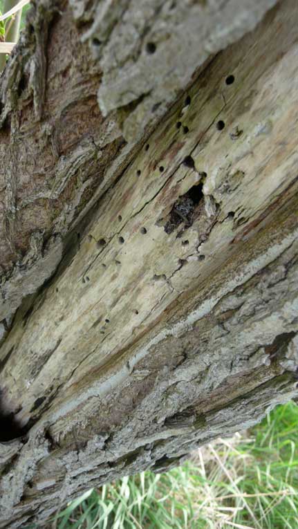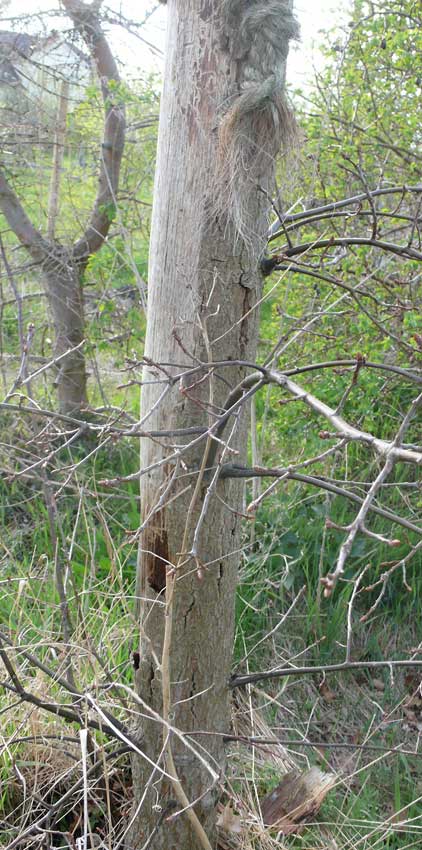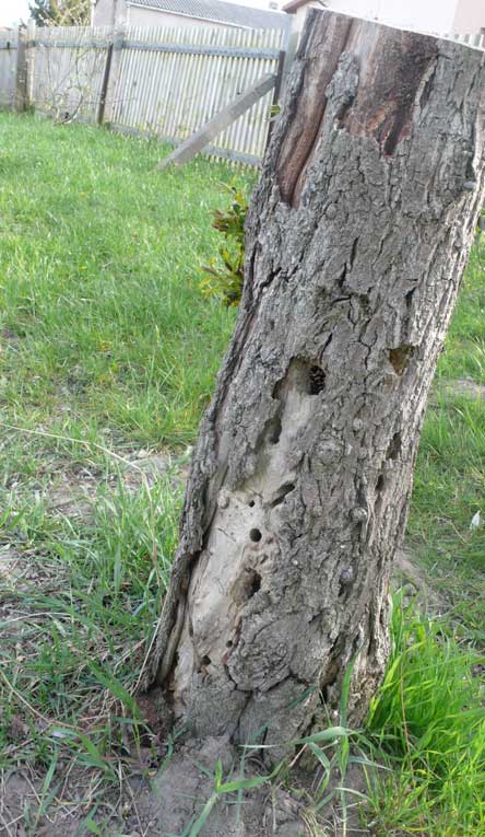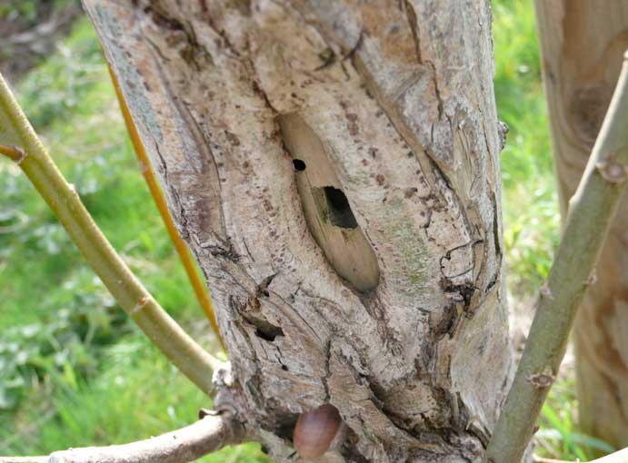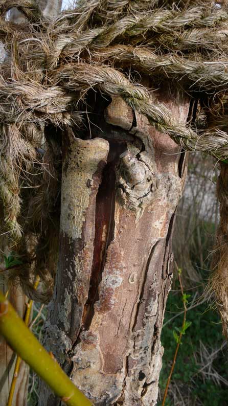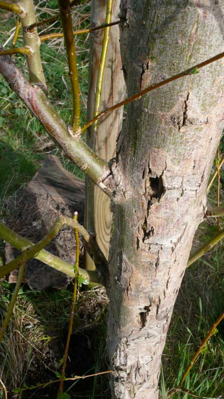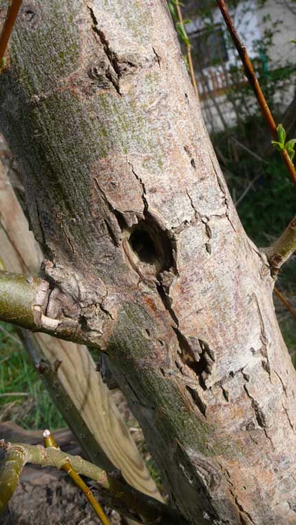 Rechts das mit Baumwachs geschlossene Loch zeigt wie der Secht sichs schon holt.