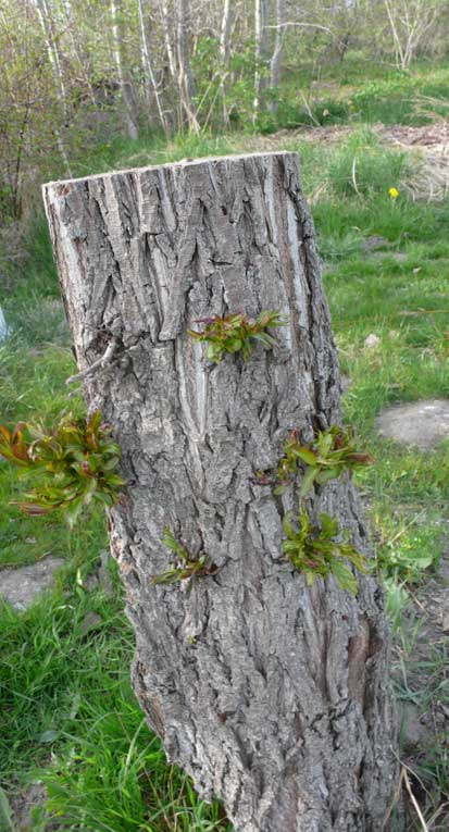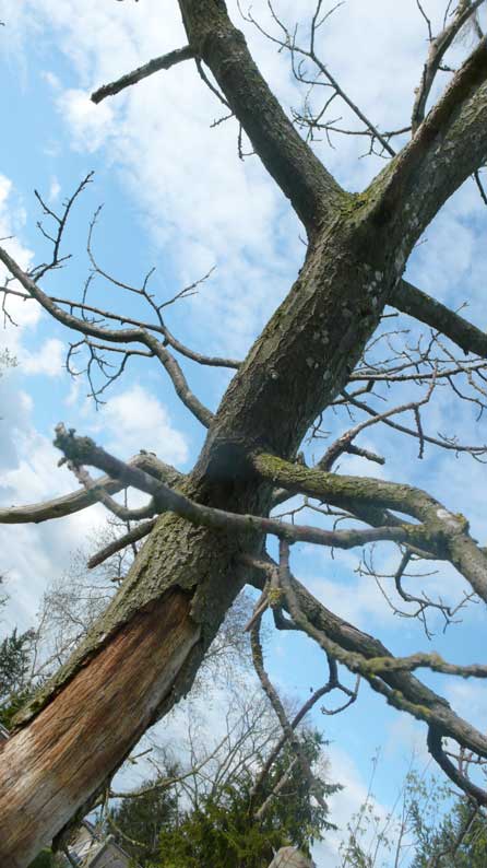 Diese Eiche war die grösste. Neues Knospen am Stumpf. Das Gegenmittel heisst Astac Forst und hochgiftig. Alle Stämme müssen eingeschmiert werden, Baum für Baum und hochhinauf, die Zweige auch und beobachtet, Mit dem Pinsel in die Löcher.