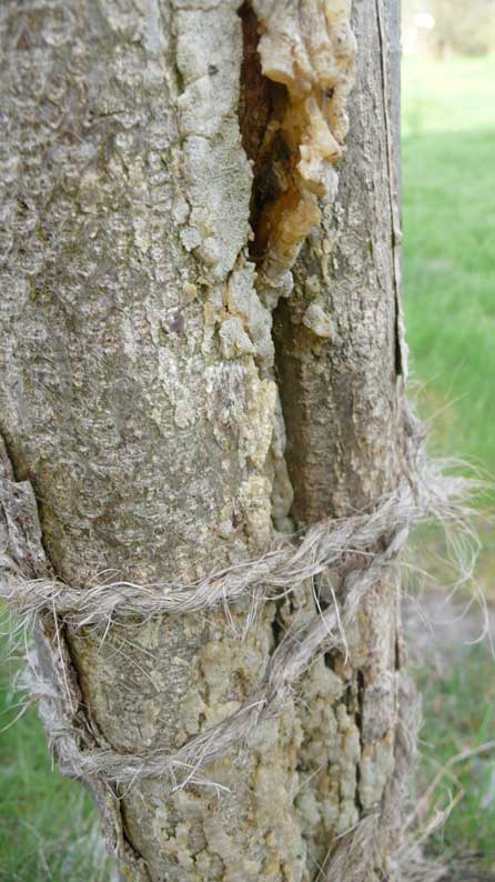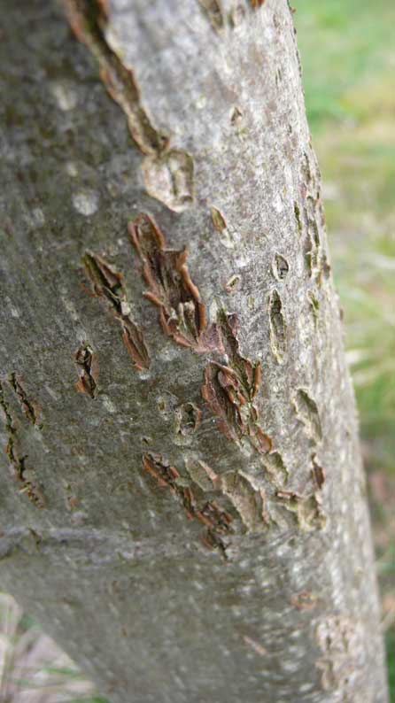 Bei der genaueren Untersuchung der Baumstämme aller neugepflanzten Bäume sehen wir die Schäden durch den schwarzen Bohrwurm. Wenn wir nichts tun sind sie bald tot.