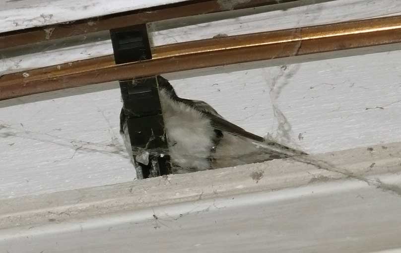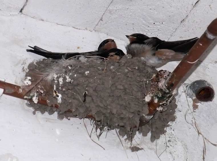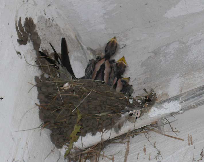 Die Mutter links tief ins Nest gebeugt, rechts die Jungen waren am Morgen danach leblos. Und die Mutter wie abhanden gekommen. Nicht mehr zu sehen.Warum. Die Jungen in sich verkrochen noch warm. Alles über der Eingangstür zur Küche. Sehr nah.