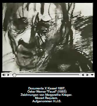 Margarethe Krieger aber, die den Oskar Wernen, ihren Lebensmenschen, mir brachte, in denFilmen vom Theater seiner letzten Jahre noch mal, hinten auf dem Land, zeichnete den Sterbenden nun als Faust als Vorstellung in seinem letzten Projekt und hinterlassenem Ton dazu, als alten wie man sagt Gezeichneten, von mir gerade so gewollt auch in allen Rollen, in eins. Für die documenta 1997 als Film. Hier der apotheotische Schluss. Des äussertsen Elends im hohen Sinn. Doch davon vielleicht morgen mehr.