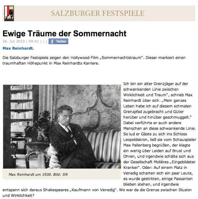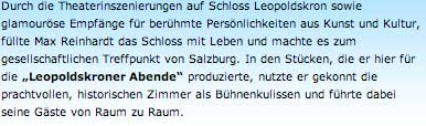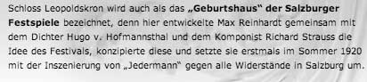 1918 nach dem Ende der Monarchie in Österreich erwarb Max Reinhardt über Salzburg gegenüber der Festung das Schloss Leopoldskron den Besitz der Erzbischöfe aus den Erlösen seines Theaterimoperiums und gründete von dort aus die Festspiele in Salzburg, zusammen mit Hugo vn Hofmannsthal. Dort auch hielt er abends Hof für private Gäste des Theaters, auch in Form des Theaters selbst. Jetzt, im 90 Jahre nach der Gründung entdecken die Festspiele ihren Gründungsort wieder mit Theater. Und man möchte sich wünschen, sie dächten nach, wie das alles zusammen gehört. Auch hier hatten die geistlichen Erbauern die Kirchenund den Dom, immer in der Achse des Blicks, als sie sich dort oben ansiedelten. Der neue Gründer eines neuen Sinns erfand in diesem Geiste das Spiel des Todes auf dem Platz vor dem Dom, bis heute.